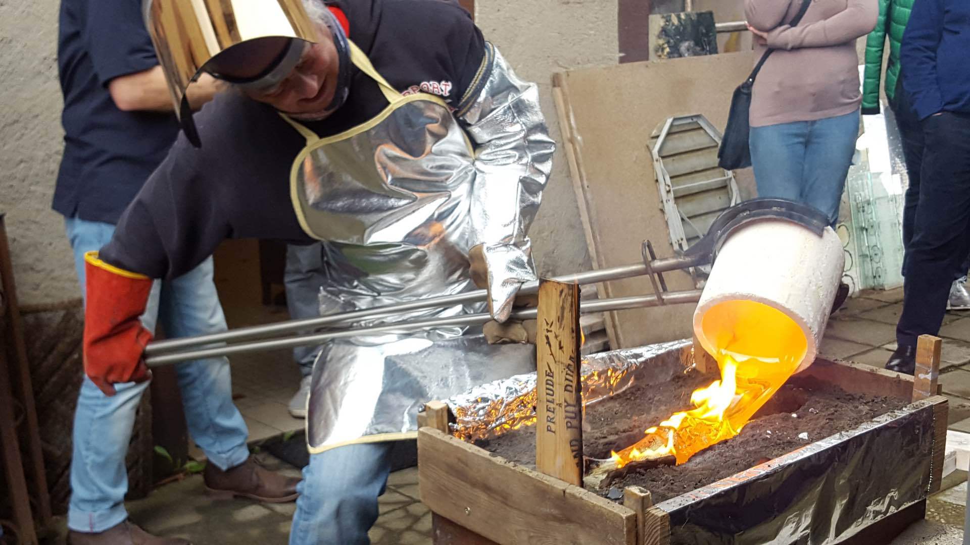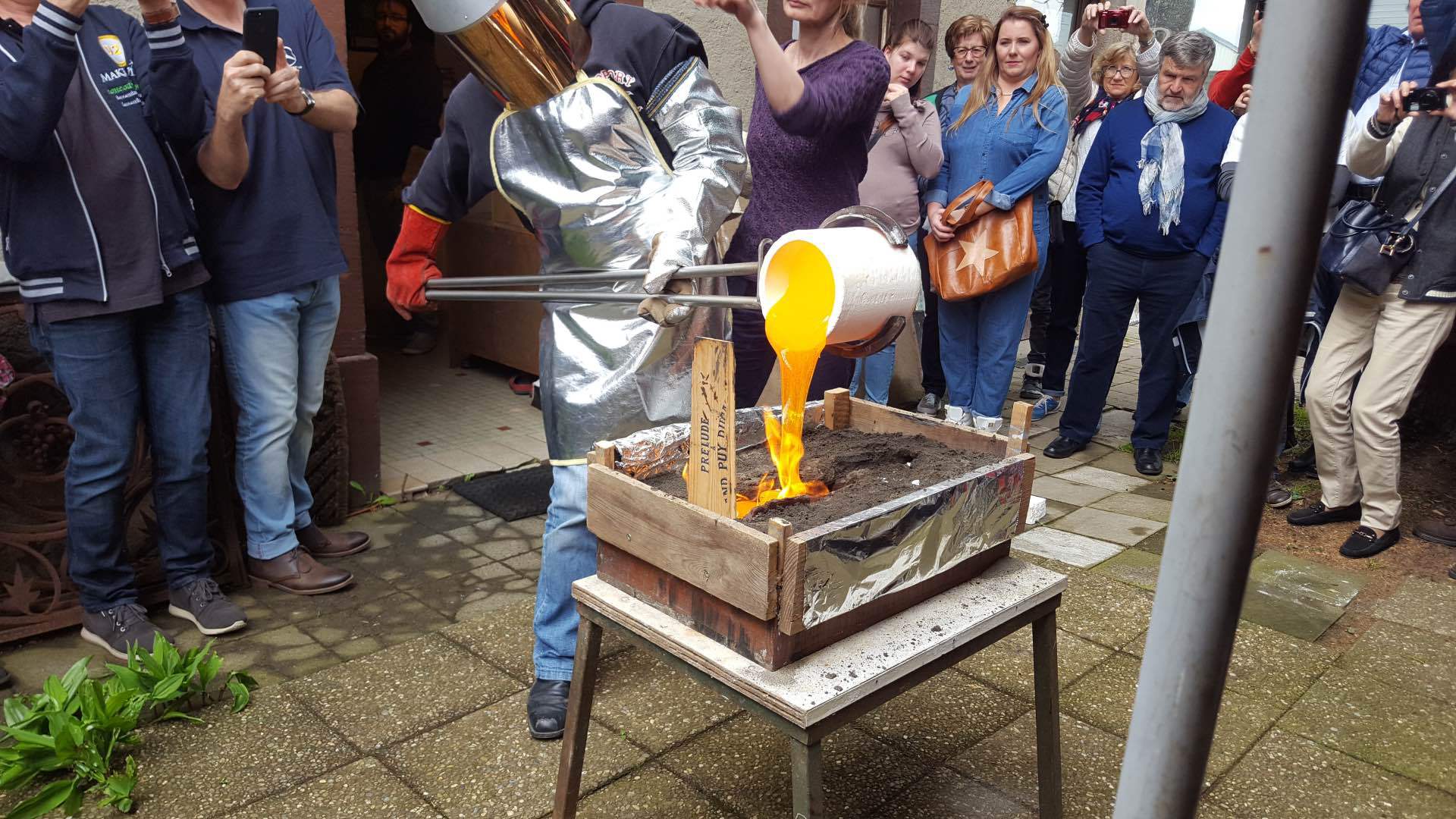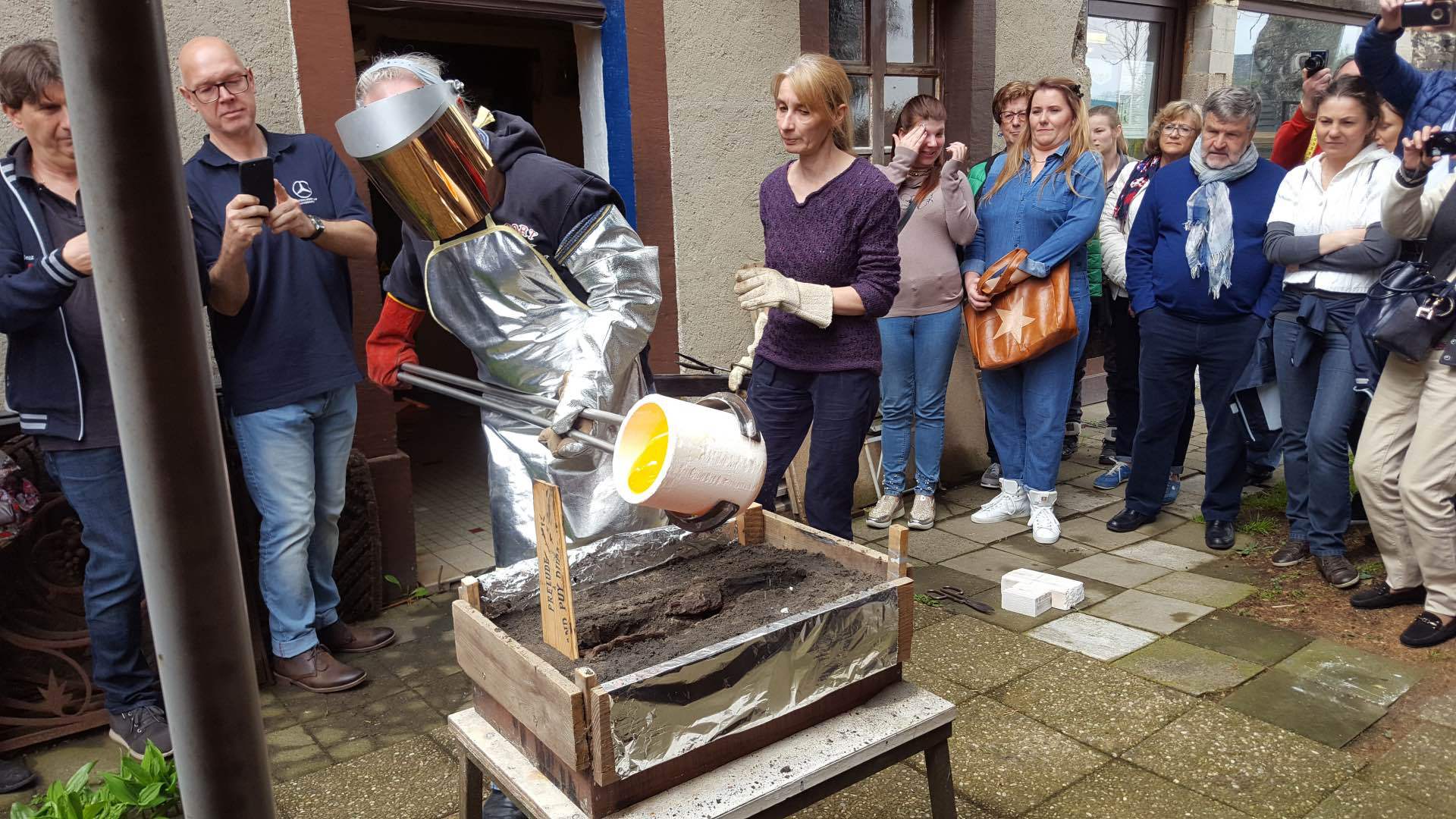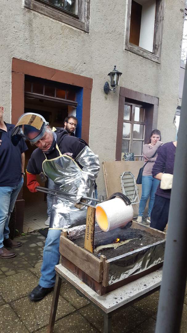 «Endlich!» mag mancher von uns gedacht haben als wir am Sonntag, den 7. Mai unseren klassischen Sternenträger aus der Garage geholt haben um an der diesjährigen Fréijorstour teilzunehmen. Nach 7 langen Monaten der Winterpause, nur durch die Jahresabschlussfeier, die Generalversammlung und den Trëppeltour unterbrochen, war es nun an der Zeit um die erste gemeinsame Fahrt der Saison zu unternehmen. Mit gefülltem Tank, gechecktem Ölstand, aufgefüllter Kühlflüssigkeit und korrekt aufgepumptem Reifen trafen nach und nach die 20 angemeldeten Fahrzeuge am Treffpunkt in Walferdingen ein, wo Kaffee und Frühstücksgebäck für die nötige Stärkung der Teilnehmer sorgten. Trotz schlechter Wetterprognose waren alle gut gelaunt und erfreut sich wiederzutreffen, und so war es nicht verwunderlich, dass niemand es dem Wettergott übel nahm, dass schon kurz nach dem Start leichter Nieselregen dafür sorgte, dass unsere blank polierten Wagen bald mit einer einheitlichen erdfarbenen Sprenkelung vom Spritzwasser überzogen wurden. Nach 82 kurvenreichen Kilometern erreichten wir über größtenteils ruhige und touristisch schöne Straßen das Öslinger Dorf Asselborn, das eigentliche Ziel unserer Ausfahrt. In der tausendjährigen (!) Asselborner Mühle, die im tiefen Tal der Tratterbaach, in einem Naturreservat wo der seltene schwarze Storch zuhause ist, eingebettet liegt, wurden wir in romantischer Einrichtung und bei willkommenem Kaminfeuer mit einem köstlichen Mittagessen verwöhnt. (Weitere Informationen über die Mühle unter: http:// www.hotelvieuxmoulin.lu/Doc/Brochure_ De.pdf ) Nach den kulinarischen Köstlichkeiten stand anschließend ein kultureller Genuss mit aktiver künstlerischer Betätigung auf dem Programm. Der Besuch des Asselborner Glaskünstlers Robert Emeringer in seinem Atelier beschränkte sich nicht aufs Zuhören und Anschauen, sondern jeder konnte seine artistischen Talente bei der Gestaltung eines Mercedessterns auf Glas unter Beweis stellen. Wir sind auf das Resultat gespannt, wenn nach etlicher Zeit der Brennvorgang im Schmelzofen abgeschlossen ist. Das Wetter hatte sich in der Zwischenzeit gebessert und zaghafte Sonnenstrahlen zeichneten schemenhafte Schatten auf den Boden, als der Glasspezialist unter freiem Himmel eine Darbietung seiner Kunst gab, wobei er 1000 Grad heißes flüssiges Glas in eine Sandform goss um eine Skulptur zu schaffen. Auch hier war das Ergebnis nicht sofort zu sehen, denn der Abkühlvorgang dauert bei solchen Kunstwerken mehrere Tage! Dieser sehr interessante Tag endete nach weiteren 91 km im Restaurant Juegdschlass in Bereldingen wo wir beim gemeinschaftlichen Abendessen diese von Jean-François Zimmer organisierte Tour, und dem an dieser Stelle unser aller Dank ausgesprochen sei, Revue passieren lassen.