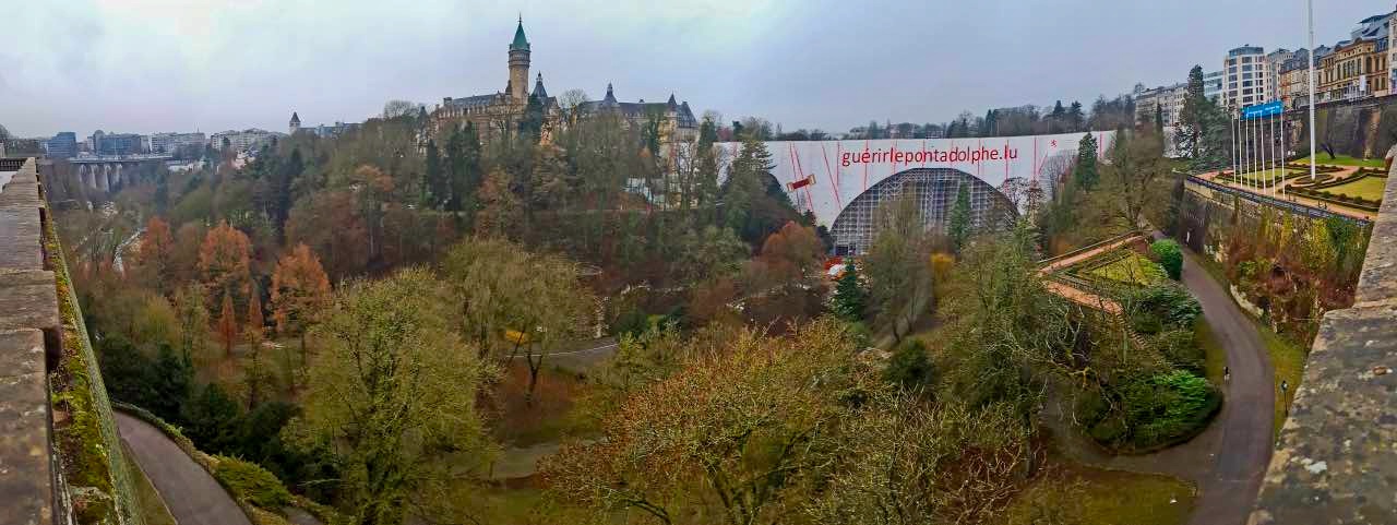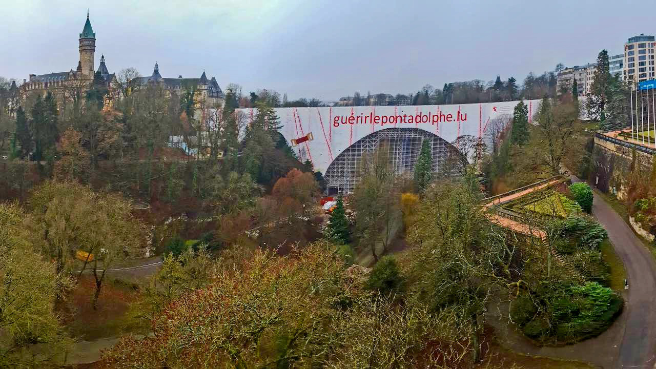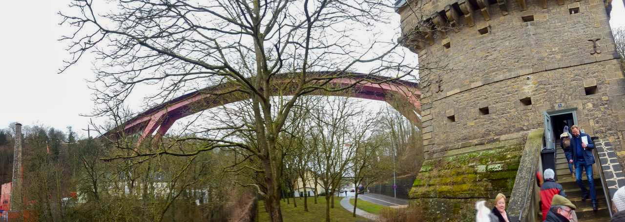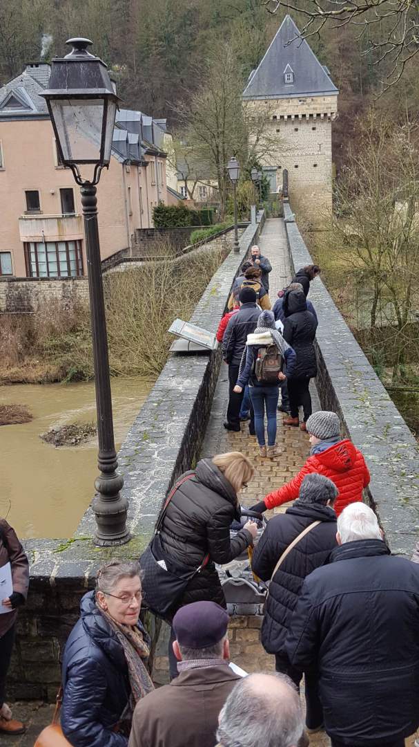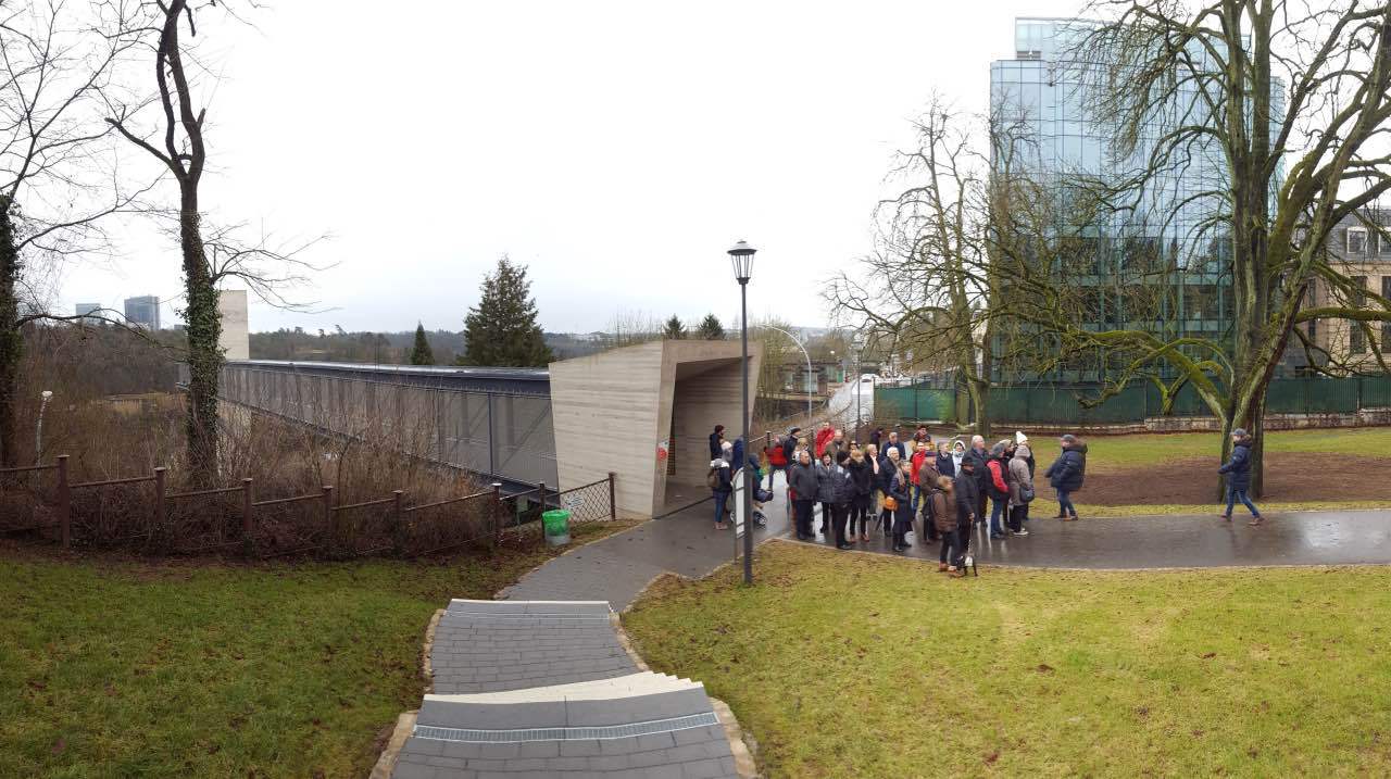 Von dort ging es weiter mit dem Bus in Richtung Kirchberg wo wir im alten Fort Thüngen, alias 3 Eechelen, die Ausstellung über die „Nei Bréck“, Pont Adolphe besuchten. Bei dieser äußerst interessanten geführten Besichtigung erfuhren wir, dass die Stadt sich erst nach der Schleifung der Festungsanlagen von ihrem engen Korsett der Festungsmauern befreien und sich städtebaulich entwickeln konnte. In diesem Kontext kam es dann zum Brückenbau und der anschließenden Bebauung des Plateau Bourbon mit den markanten Sparkassengebäuden am Brückenkopf. Es mag den einen oder anderen Besucher erstaunt haben zu hören, dass die „Nei Bréck“ mit ihrem 84 Metern messenden Bogen seinerzeit die Brücke mit der weltgrößten Spannweite war. Diese Leistung ist umso bemerkenswerter, wenn man bedenkt, dass sie in nur 3 Jahren gebaut wurde, und dass wir nun, 110 Jahre später genauso lange brauchen um sie nur zu restaurieren und an die moderne Zeit anzupassen.