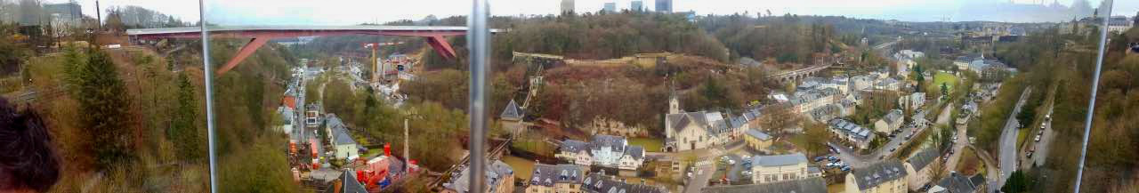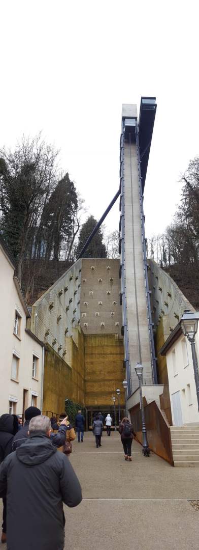 Die neueste Sehenswürdigkeit der Stadt und Touristenmagnet ersten Ranges war anschließend der brandneue Glasaufzug, der uns innerhalb einiger Sekunden vom Pfaffenthal in den 60 Meter höher gelegenen Pescatorepark hob. Wenn auch alle von der spektakulären Aussicht fasziniert waren, die dieser Panoramalift bietet, so war jedoch der Glasboden im vorderen Teil des Aufzugs nicht jedermanns Sache.