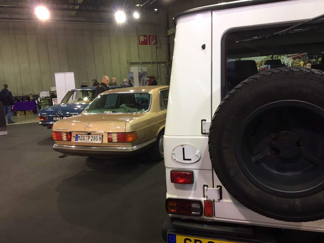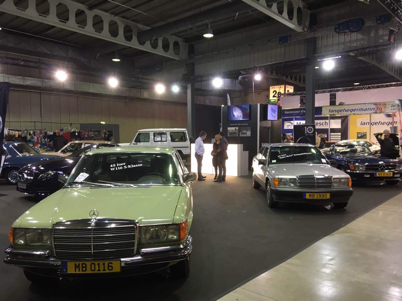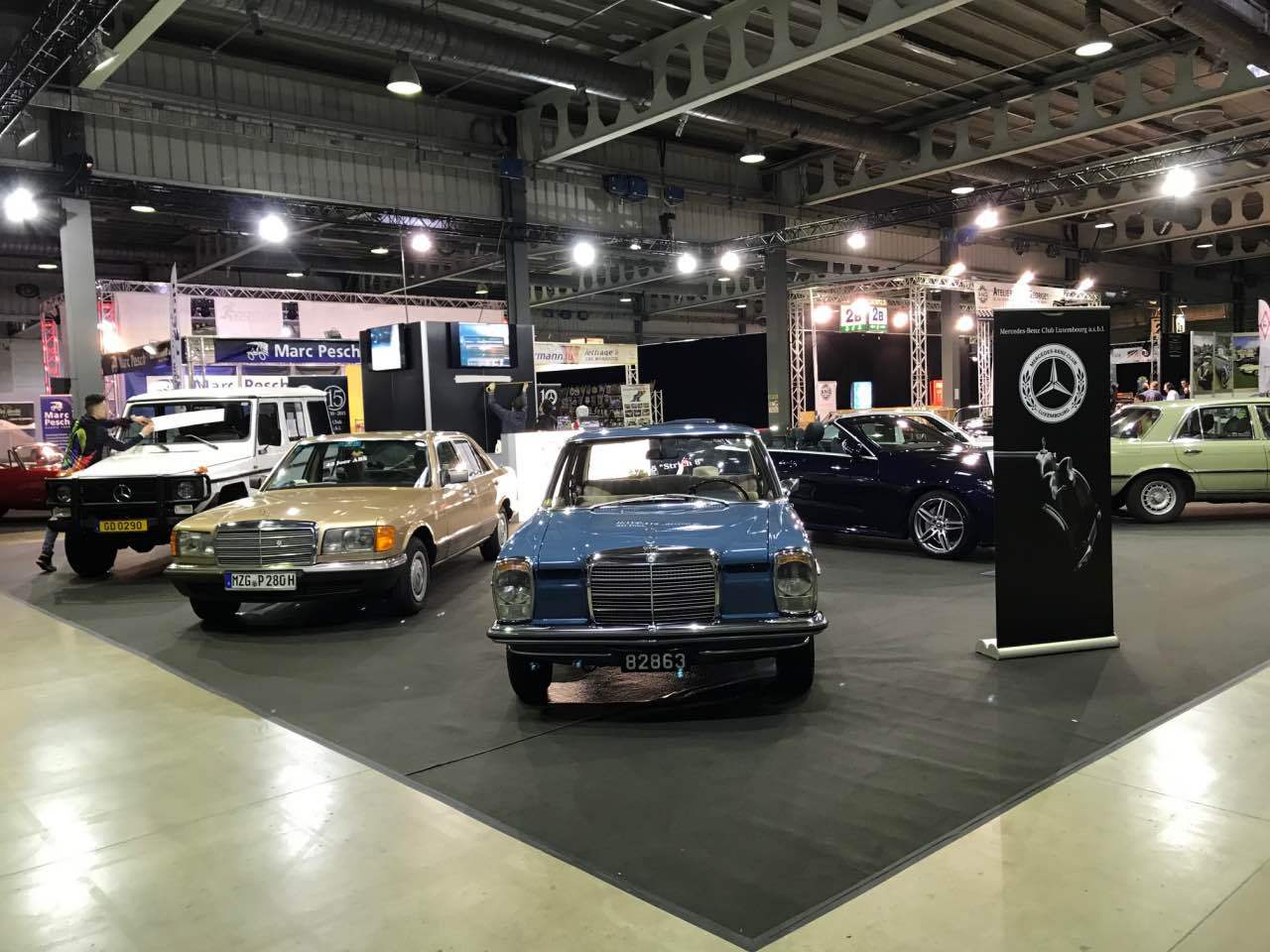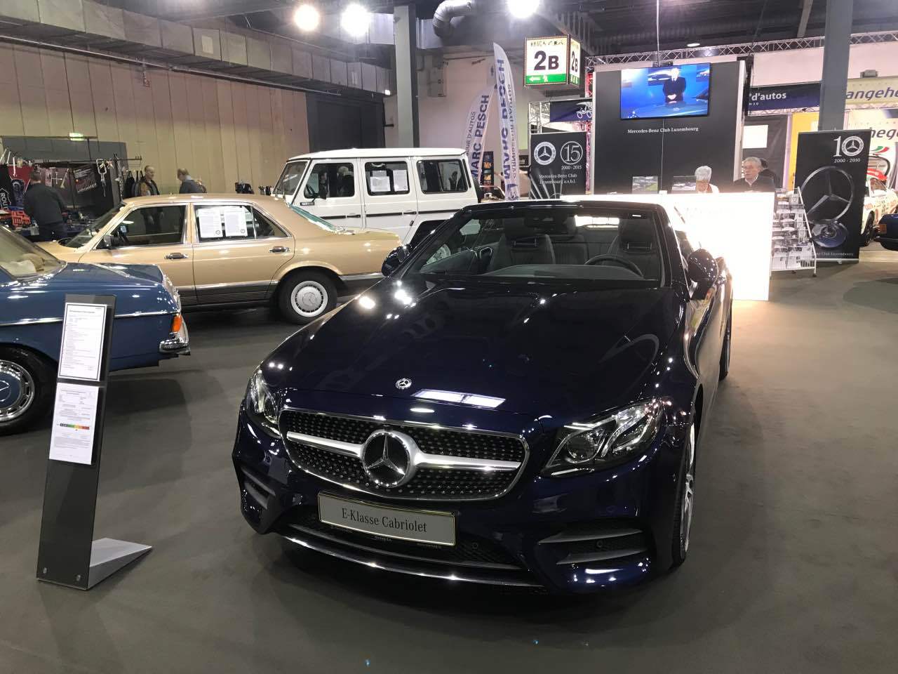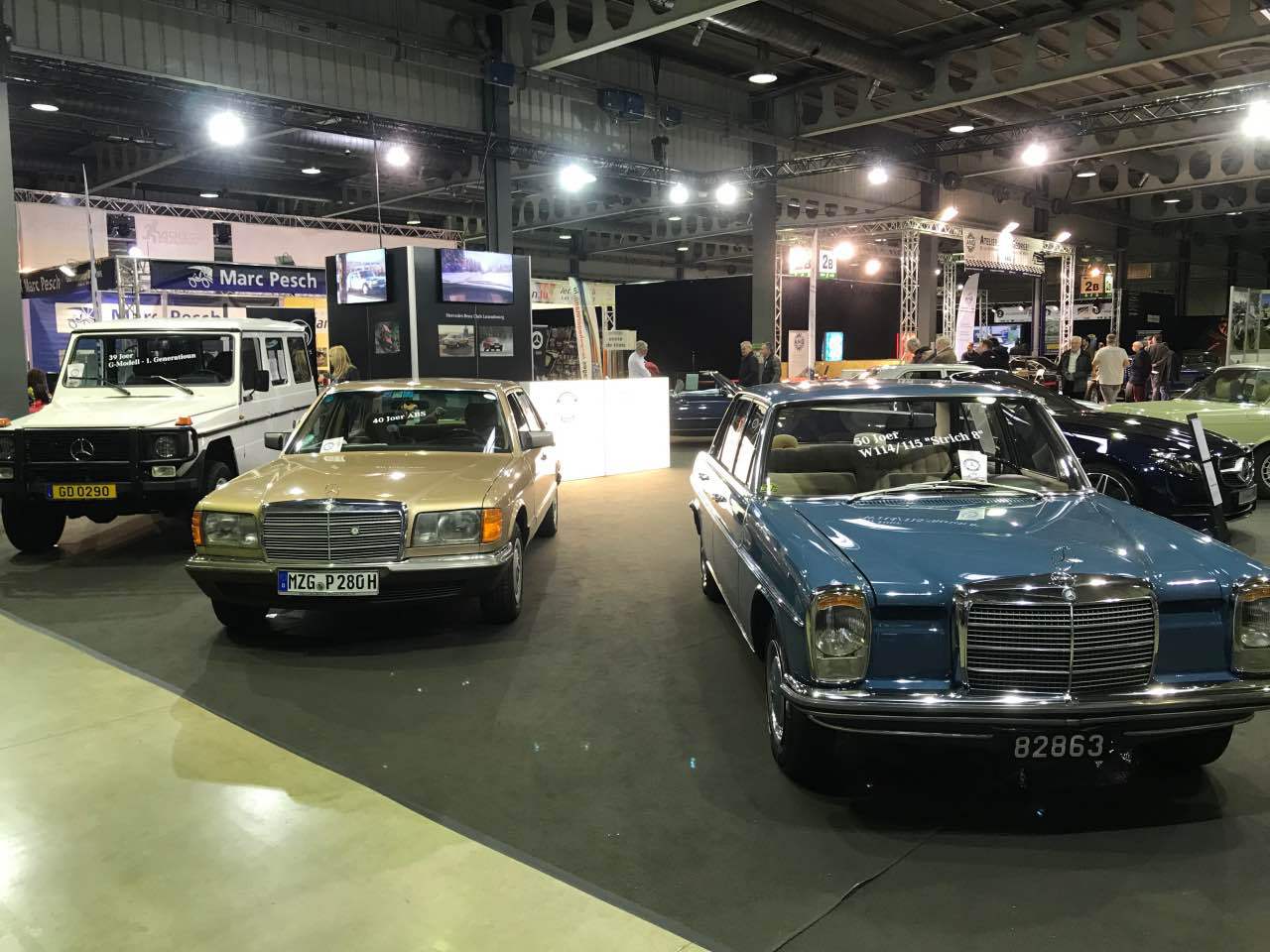 Deshalb waren ein blauer „Strich 8“ 230 E für die 50 Jahre dieser Baureihe, ein 280 SE in Kaledoniengrün für die 45 Jahre der Baureihe 116, ein 280 SE der Baureihe 126 in der Farbe Champagnermetallic für die 40 Jahre des ABS-Systems, ein astralsilberner 190 E der Baureihe W201 für die 35 Jahre des „Baby-Benz“, sowie ein 290 GD in Polarweiß für 40 Jahre G-Klasse ausgestellt. Abgerundet wurden die Exponate durch einen blauen 300 SL der Baureihe R107 sowie ein neues E-Klasse-Cabriolet, das von Merbag Luxembourg zur Verfügung gestellt wurde.