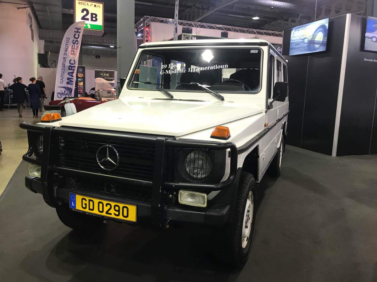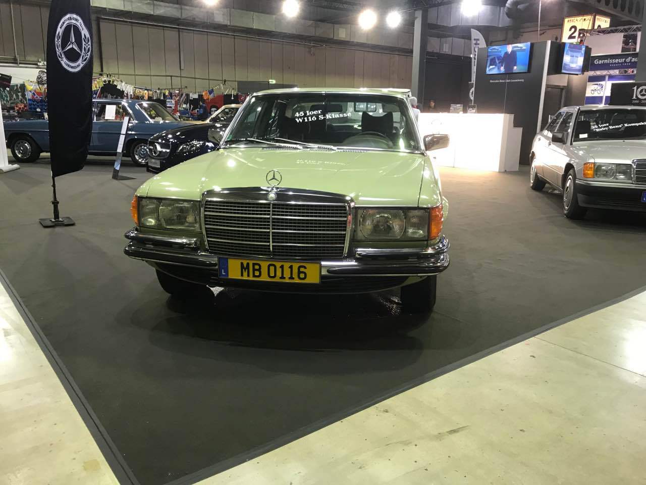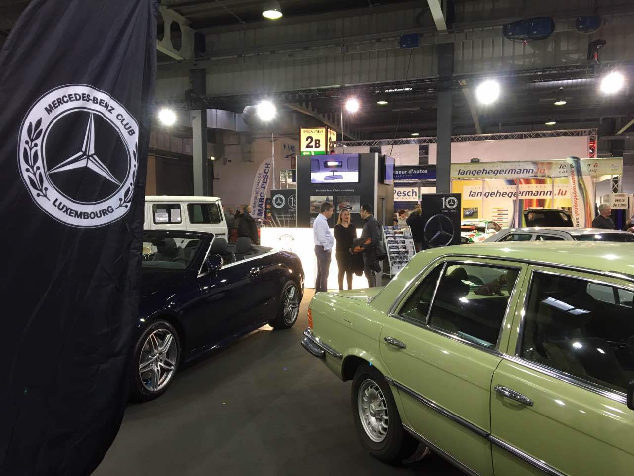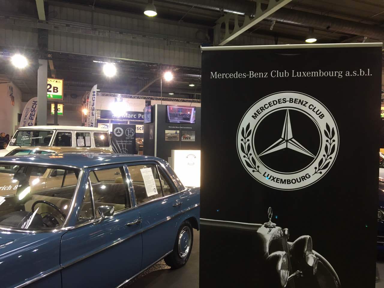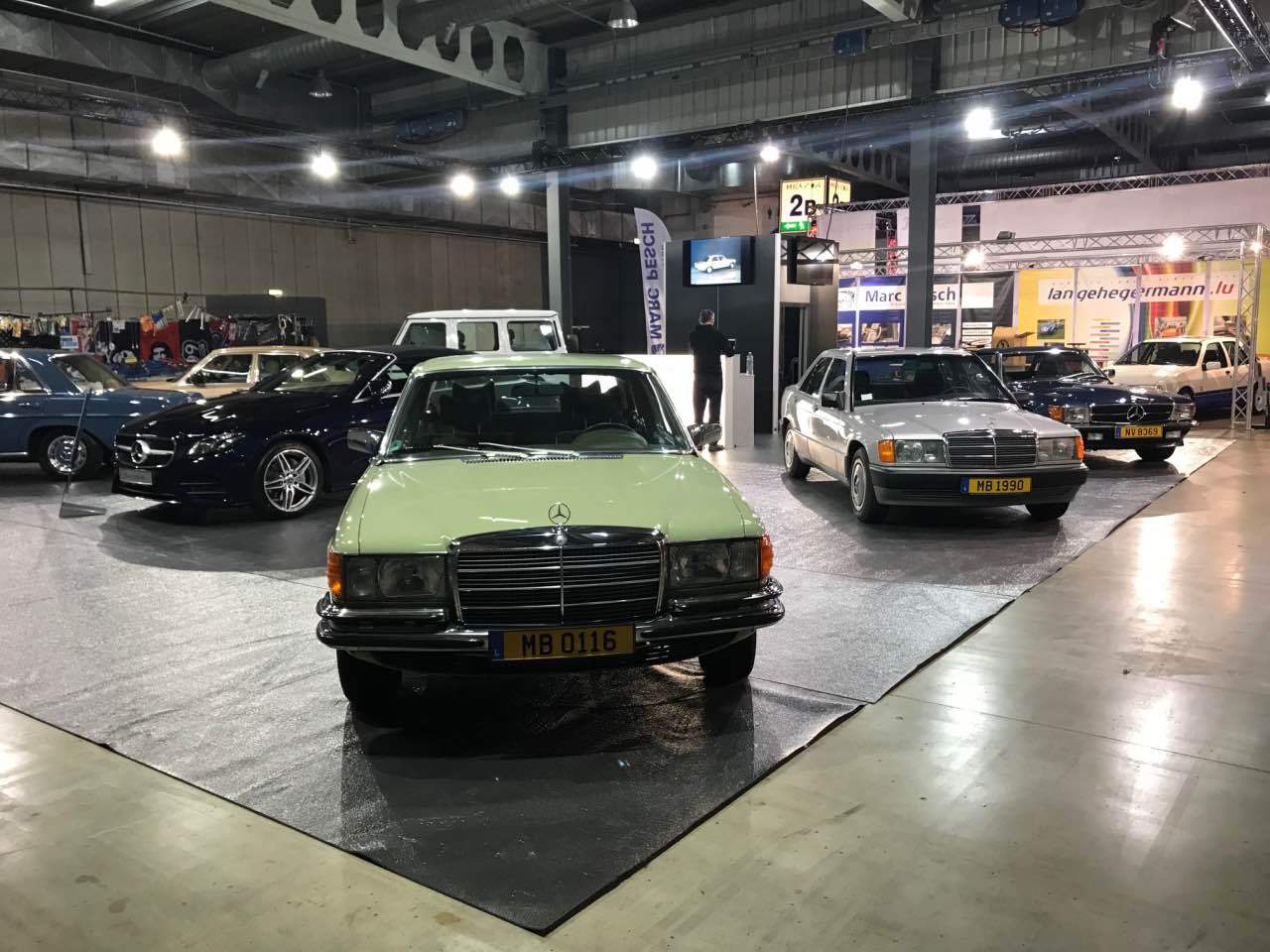Deshalb waren ein blauer „Strich 8“ 230 E für die 50 Jahre dieser Baureihe, ein 280 SE in Kaledoniengrün für die 45 Jahre der Baureihe 116, ein 280 SE der Baureihe 126 in der Farbe Champagnermetallic für die 40 Jahre des ABS-Systems, ein astralsilberner 190 E der Baureihe W201 für die 35 Jahre des „Baby-Benz“, sowie ein 290 GD in Polarweiß für 40 Jahre G-Klasse ausgestellt. Abgerundet wurden die Exponate durch einen blauen 300 SL der Baureihe R107 sowie ein neues E-Klasse-Cabriolet, das von Merbag Luxembourg zur Verfügung gestellt wurde.
