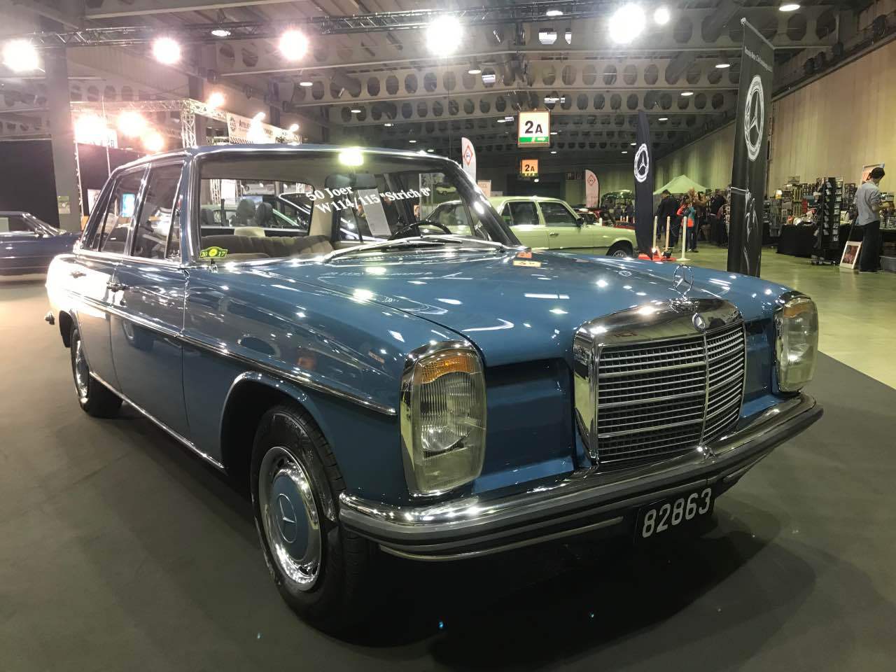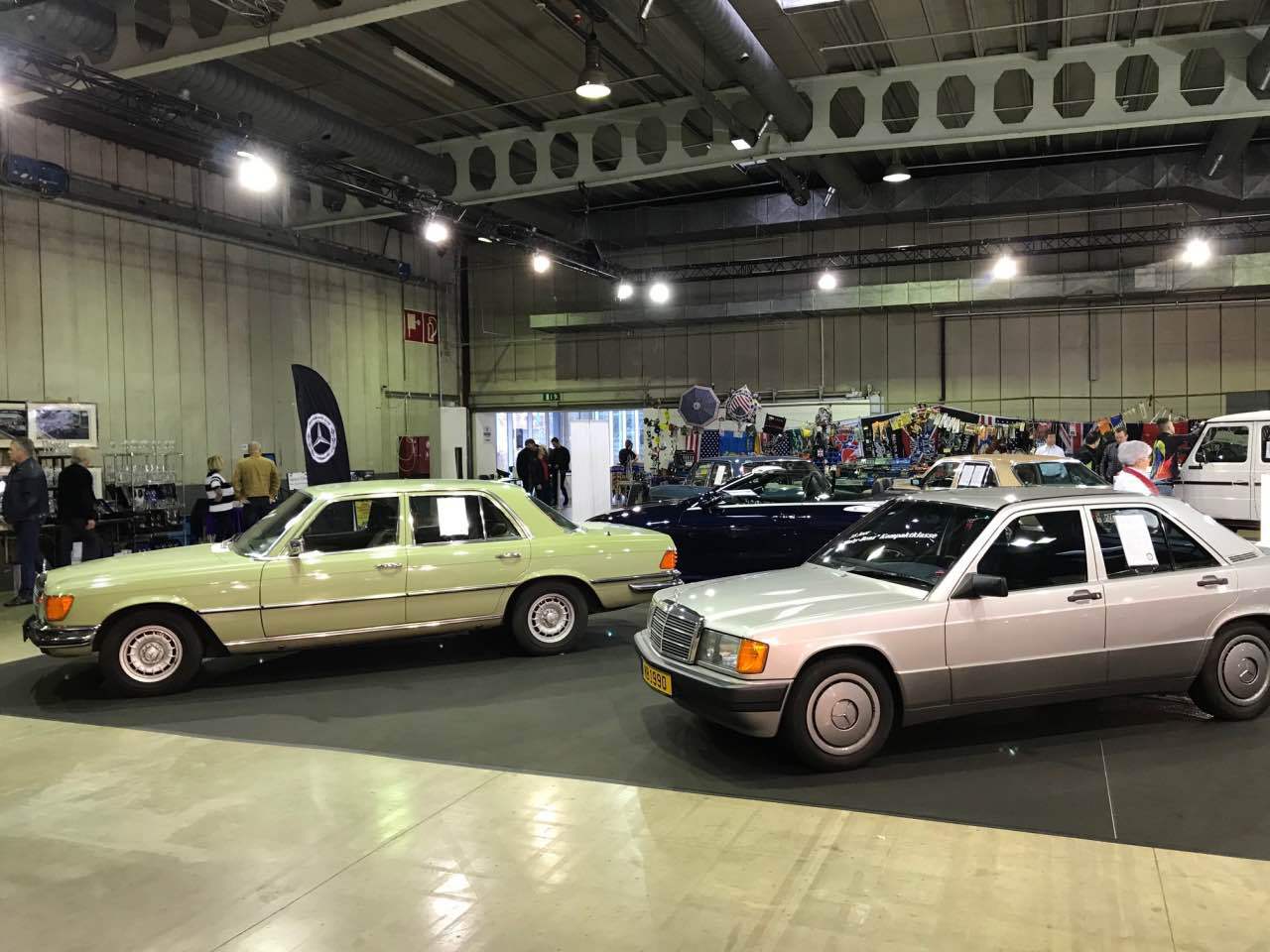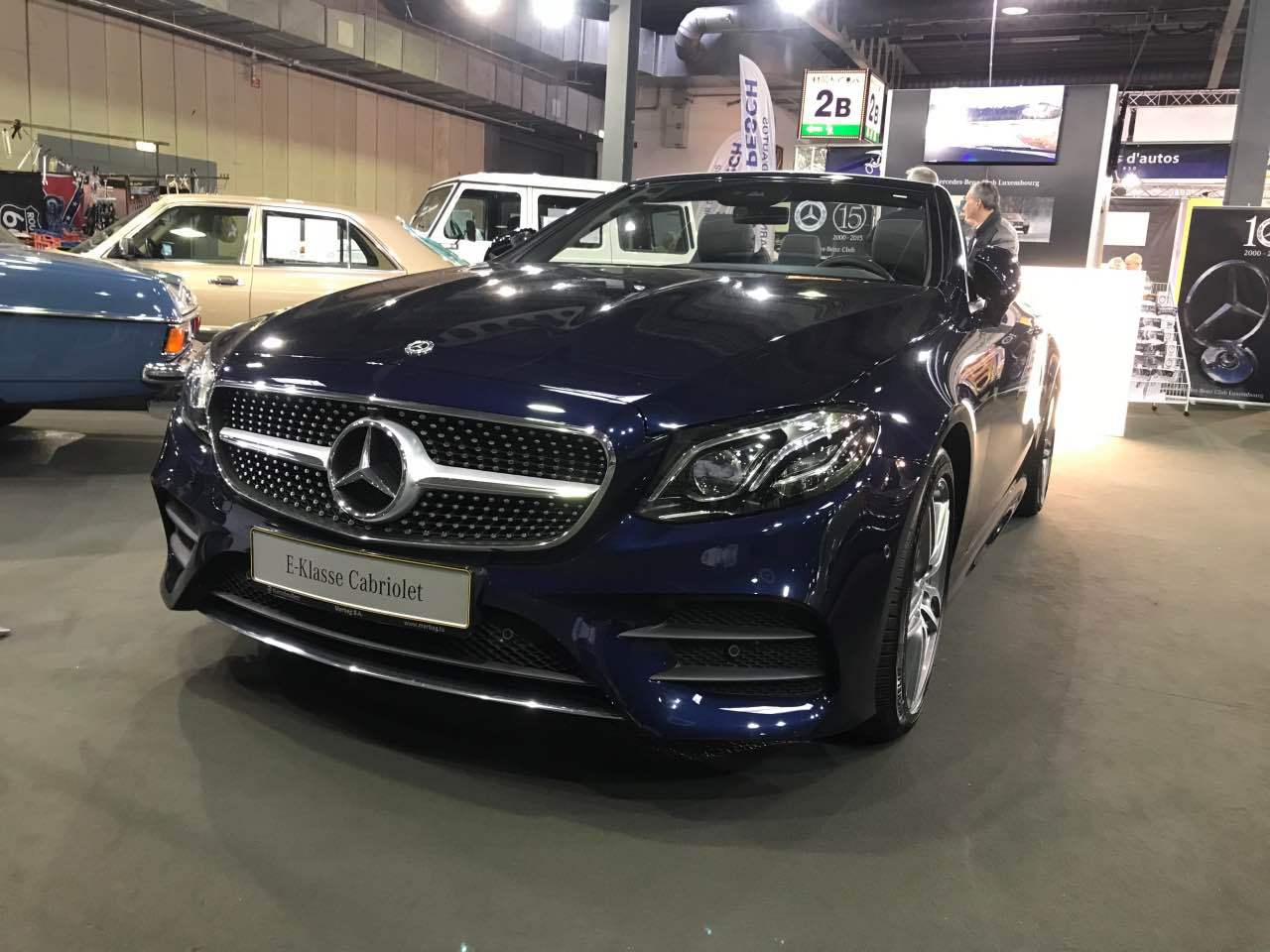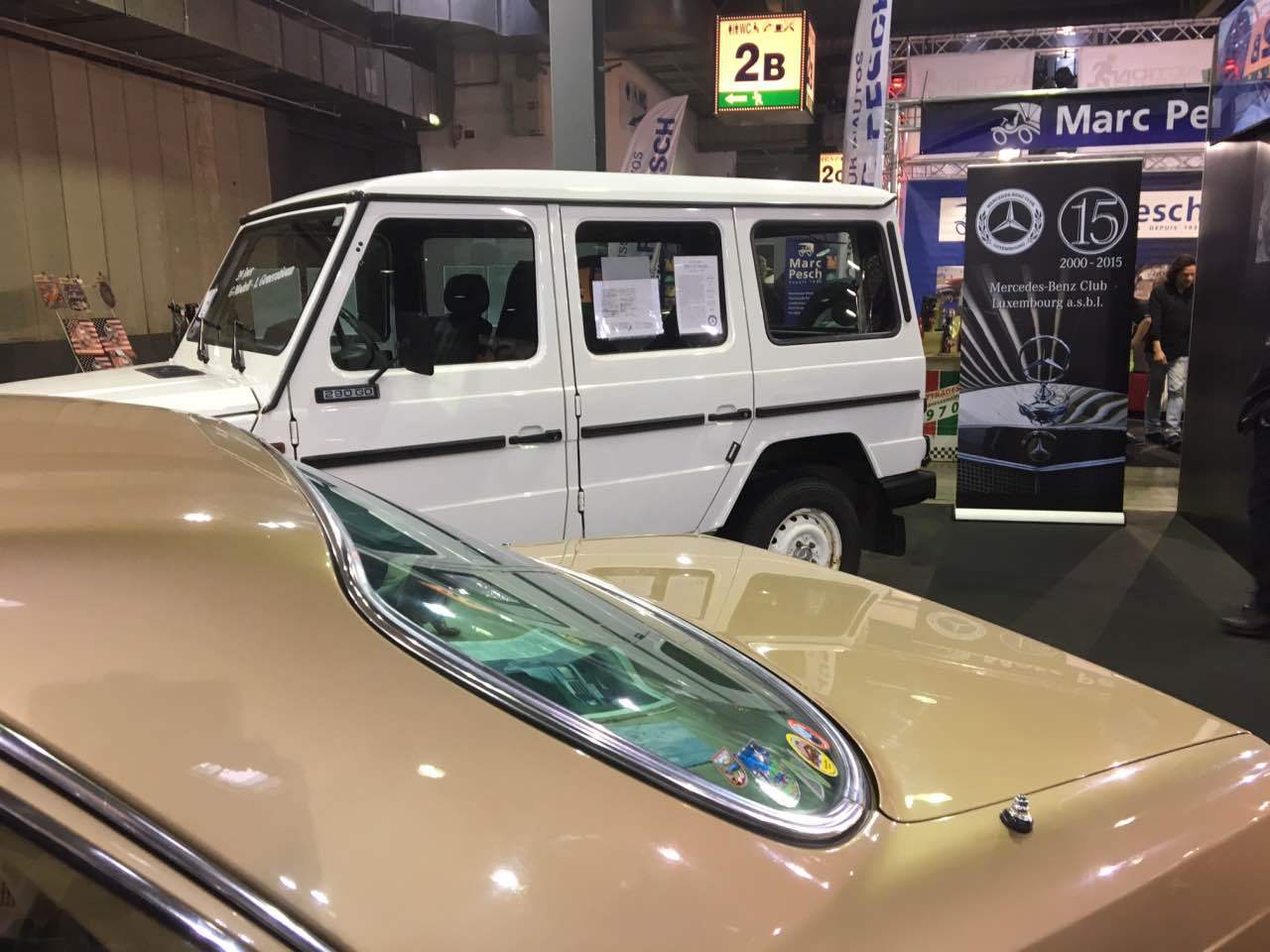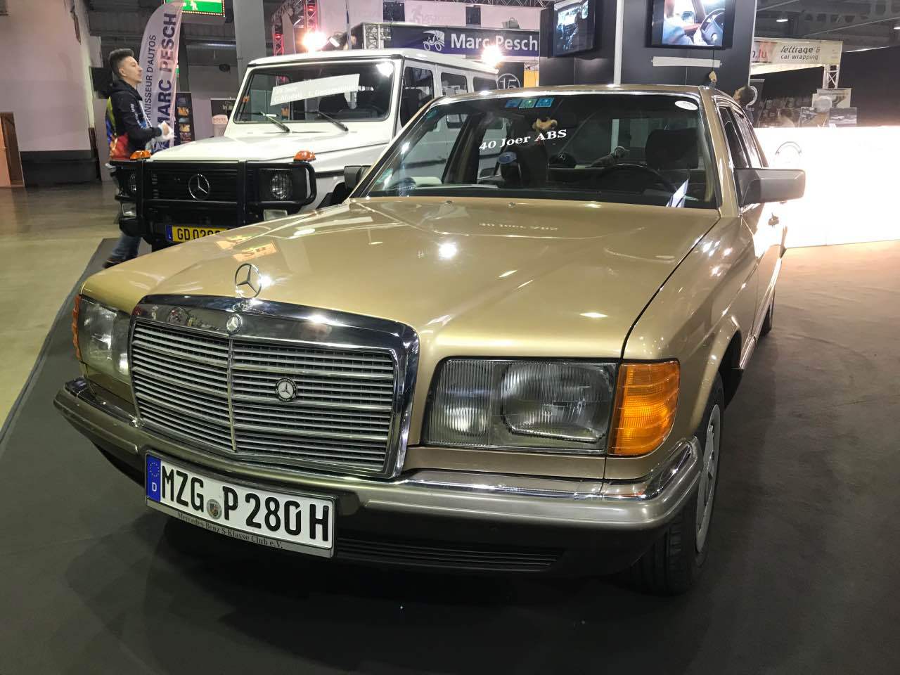 Deshalb waren ein blauer „Strich 8“ 230 E für die 50 Jahre dieser Baureihe, ein 280 SE in Kaledoniengrün für die 45 Jahre der Baureihe 116, ein 280 SE der Baureihe 126 in der Farbe Champagnermetallic für die 40 Jahre des ABS-Systems, ein astralsilberner 190 E der Baureihe W201 für die 35 Jahre des „Baby-Benz“, sowie ein 290 GD in Polarweiß für 40 Jahre G-Klasse ausgestellt. Abgerundet wurden die Exponate durch einen blauen 300 SL der Baureihe R107 sowie ein neues E-Klasse-Cabriolet, das von Merbag Luxembourg zur Verfügung gestellt wurde.