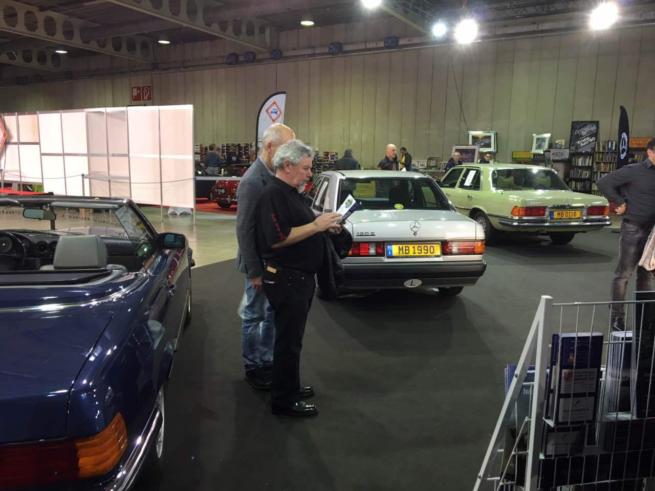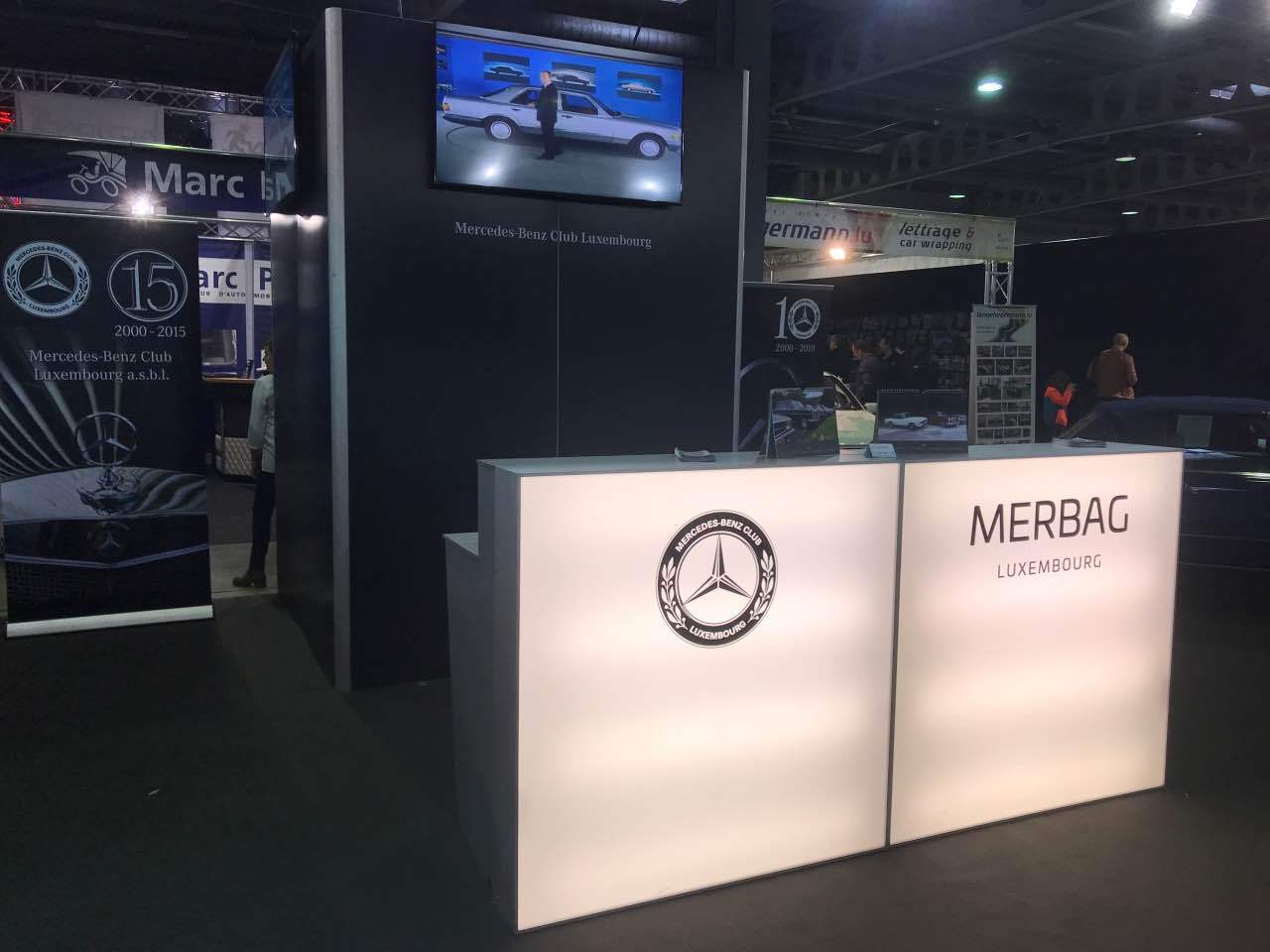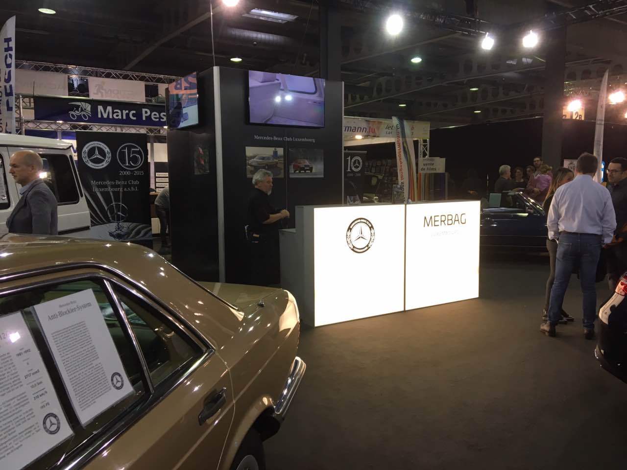 An den Bildschirmen, die auf der Wand des Clubstandes befestigt waren, wurden Filme aus der Entwicklung der ausgestellten Baureihen gezeigt. Wie jedes Jahr stattete auch Wirtschaftsminister und bekennender Mercedes-Benz Oldtimer-Fan Etienne Schneider unserem Messestand einen längeren Besuch ab. Im Laufe der Ausstellung erhielt der Club eine Reihe von Original-Prospekten und Postern der ausgestellten Fahrzeuge, aus der Hand eines Sammlers und fachkundigen Kenners der Mercedes-Benz Baureihen. Wir bedanken uns herzlich für diese Spende, die das Archiv des Clubs bereichert und bei kommenden Ausstellungen sehr hilfreich sein wird.