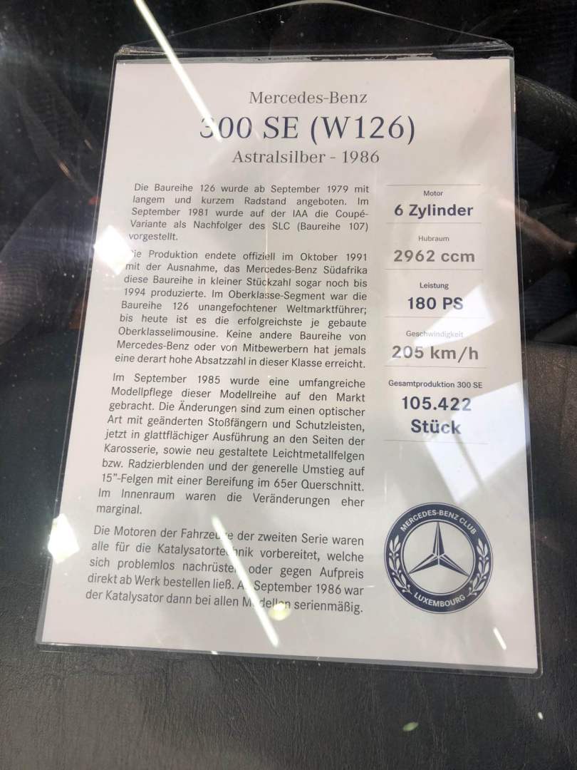 Die ausgestellten Fahrzeuge waren genaustens beschrieben mit ihren jeweiligen interessanten Lebensgeschichten. Viele Besucher des Clubstandes bewunderten den ausnahmslos ausgezeichneten Zustand der Fahrzeuge. An den beiden Ausstellungstagen betreuten Vorstandsmitglieder des Mercedes-Benz Clubs die Anfragen der Besucher. Interessante Kontakte wurden geknüpft und mehrere Neumitglieder angeworben.