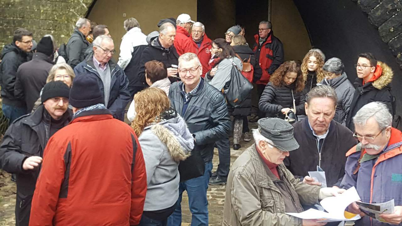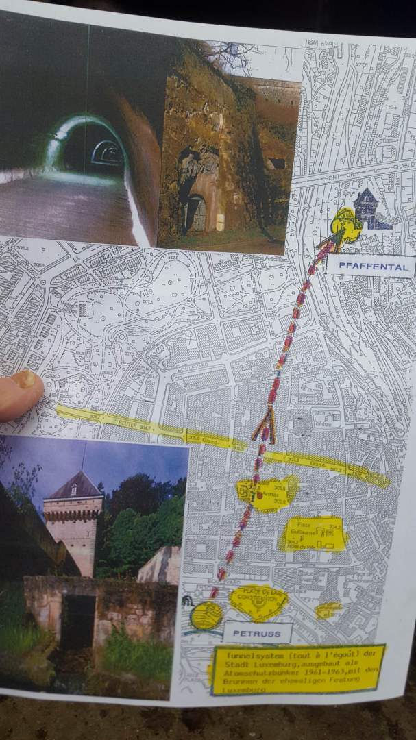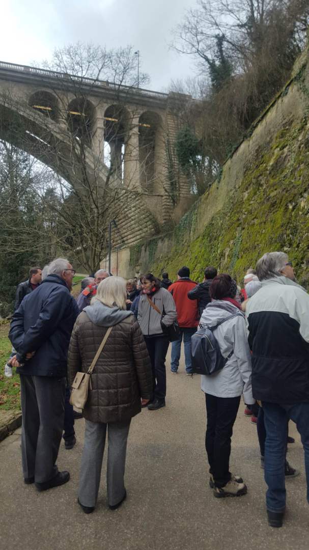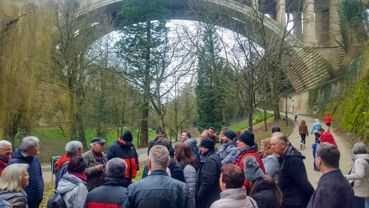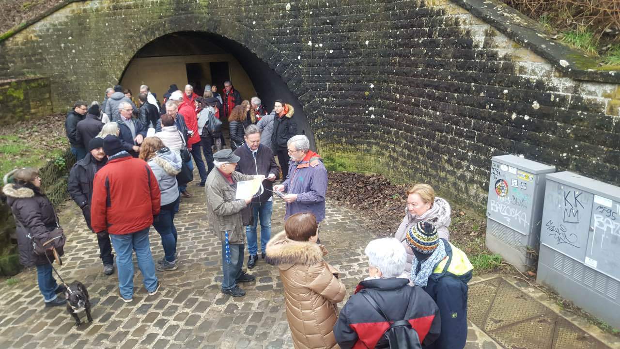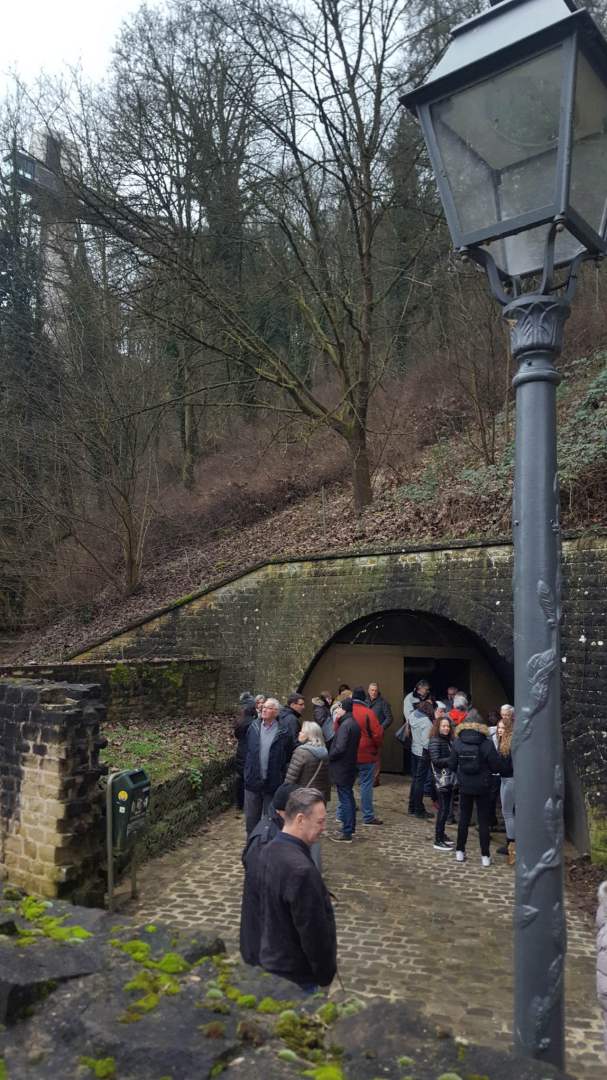 Als Auftakt der Clubaktivitäten war dieses Jahr unsere „Trëppeltour“ wieder die erste Gelegenheit, um uns unter Freunden wie- derzusehen. Am Sonntag, dem 9. Februar 2020 hatten sich 49 Neugierige und Bewe- gungshungrige in Pfaffenthal getroffen, um an der von Vorstandsmitglied Guy Rolling organisierten Tour teilzunehmen, bei der wir die Stadt Luxemburg auf eine ungewohnte Weise erkunden sollten. Nach dem obliga- ten Café-Croissant öffneten sich die Tore zur Unterwelt und wir tauchten ein in den Bauch der Stadt. Vor uns tat sich der 900 m lange Aquatunnel auf, der die Unterstadt Pfaffent- hal mit dem Petrusstal verbindet. Entgegen der Erwartungen handelt es sich hier nicht um eine Kasematte der Festungsanlage, son- dern um eine Konstruktion neueren Datums die friedlichen Zwecken dient, und zwar als Kanal, der das Abwasser der Stadtteile Merl, Belair und Cessingen zur Kläranlage in Beg- gen leitet. Der alte Kanal konnte nicht er- neuert werden, und so war dieser Tunnel, der in den Jahren 1961 bis 1963 in den Fels gesprengt wurde, der kürzeste Weg für eine neue Ableitung. Diese Verbindung liegt rund 50 m unter der Stadt und zeigt auf Straßen- schildern an, unter welcher Straße man sich gerade befindet. Besonders beeindruckend ist der Festungsbrunnen der Place d’Armes, durch den man vom Tunnel aus den Blick nach oben richten und das Tageslicht erbli- cken kann.