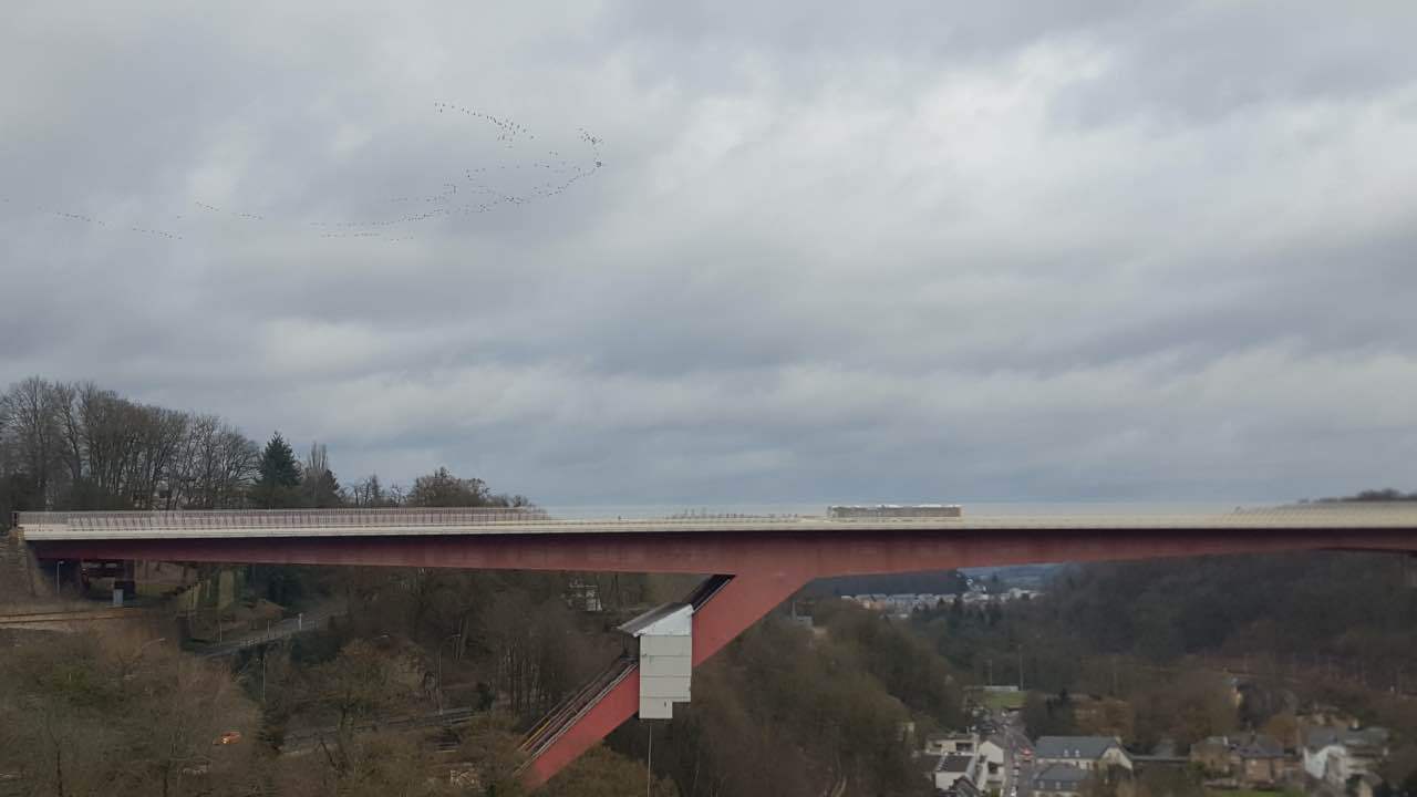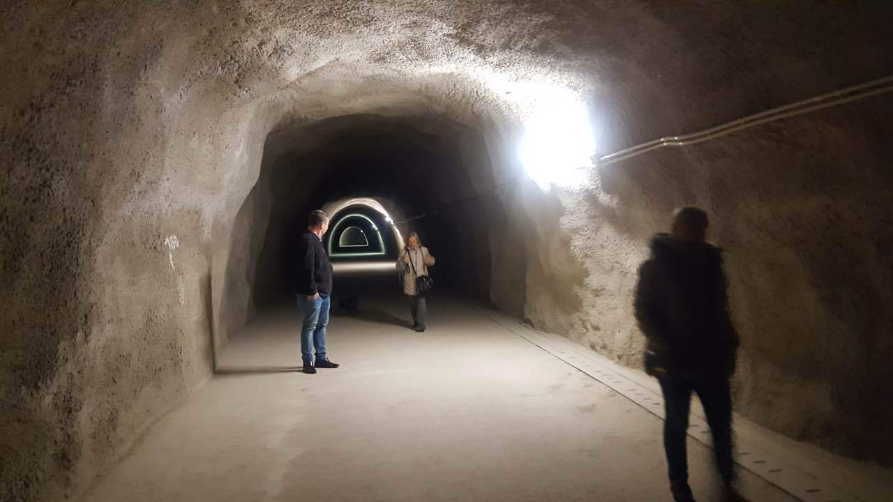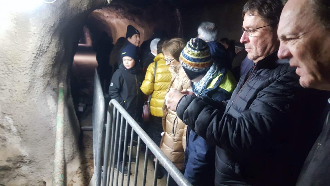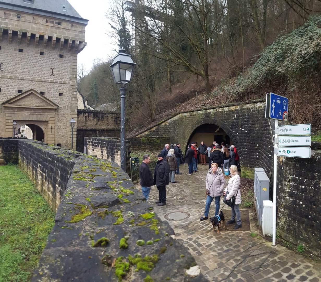 Als Auftakt der Clubaktivitäten war dieses Jahr unsere „Trëppeltour“ wieder die erste Gelegenheit, um uns unter Freunden wie- derzusehen. Am Sonntag, dem 9. Februar 2020 hatten sich 49 Neugierige und Bewe- gungshungrige in Pfaffenthal getroffen, um an der von Vorstandsmitglied Guy Rolling organisierten Tour teilzunehmen, bei der wir die Stadt Luxemburg auf eine ungewohnte Weise erkunden sollten. Nach dem obliga- ten Café-Croissant öffneten sich die Tore zur Unterwelt und wir tauchten ein in den Bauch der Stadt. Vor uns tat sich der 900 m lange Aquatunnel auf, der die Unterstadt Pfaffent- hal mit dem Petrusstal verbindet. Entgegen der Erwartungen handelt es sich hier nicht um eine Kasematte der Festungsanlage, son- dern um eine Konstruktion neueren Datums die friedlichen Zwecken dient, und zwar als Kanal, der das Abwasser der Stadtteile Merl, Belair und Cessingen zur Kläranlage in Beg- gen leitet. Der alte Kanal konnte nicht er- neuert werden, und so war dieser Tunnel, der in den Jahren 1961 bis 1963 in den Fels gesprengt wurde, der kürzeste Weg für eine neue Ableitung. Diese Verbindung liegt rund 50 m unter der Stadt und zeigt auf Straßen- schildern an, unter welcher Straße man sich gerade befindet. Besonders beeindruckend ist der Festungsbrunnen der Place d’Armes, durch den man vom Tunnel aus den Blick nach oben richten und das Tageslicht erbli- cken kann.