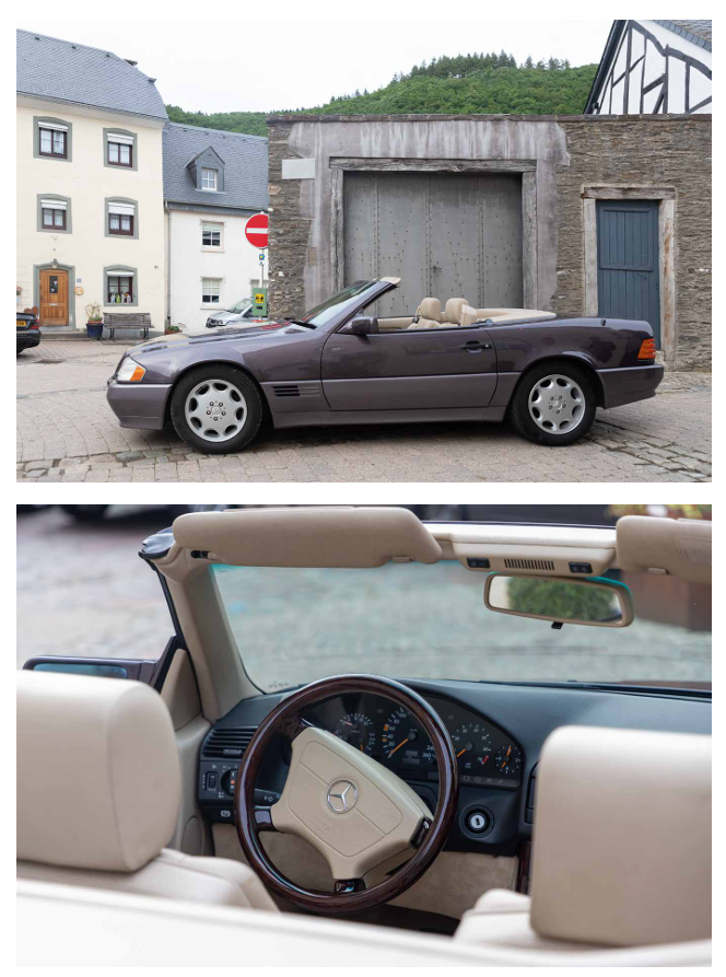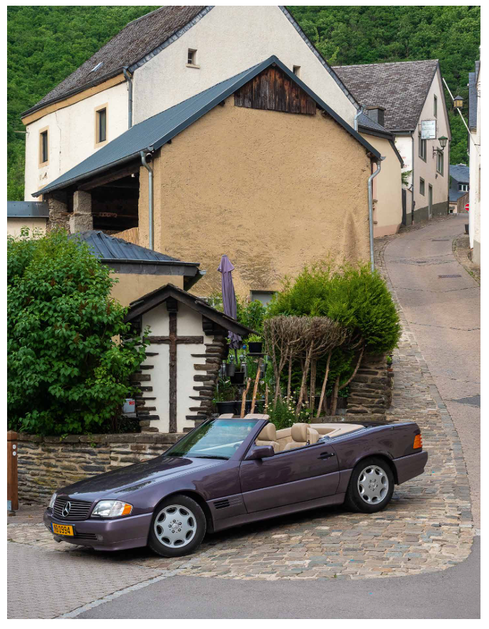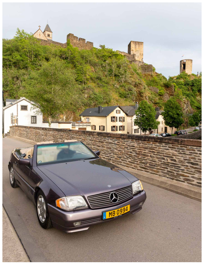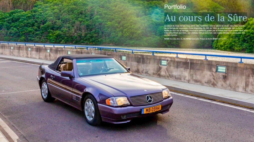 Le retour du beau temps nous attire vers l’extérieur, vers la nature en réveil, vers l’eau onduleuse. Le temps de nous parer d’une Mercedes SL 280 de 1994, et nous partons vers la Sûre. Après un tour sur le barrage, nous nous laissons guider par la rivière pour nous arrêter dans son méandre d’Esch-sur-Sûre, son château-fort en sommeil, ses ruelles étroites et sinueuses, ses rochers boisés.