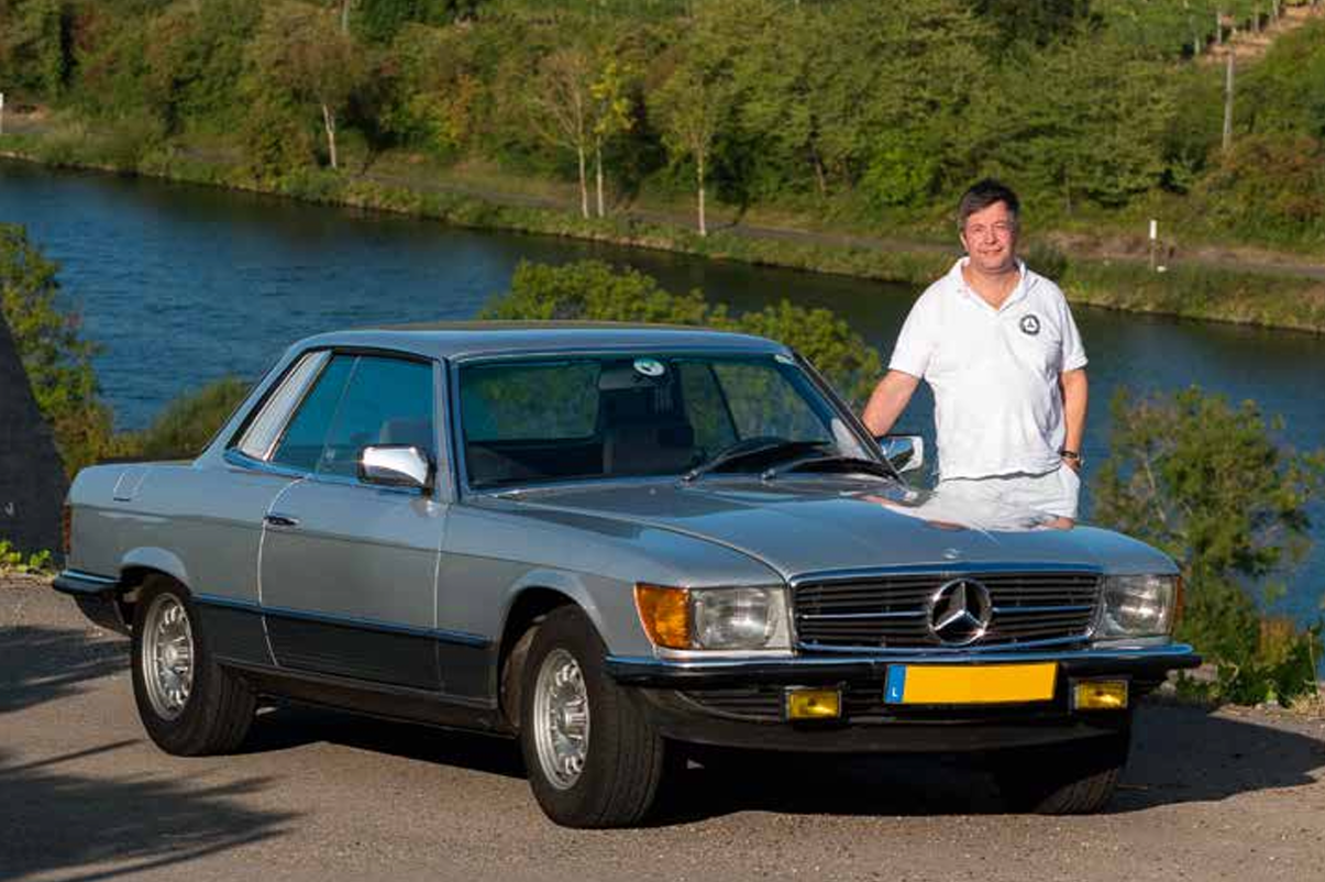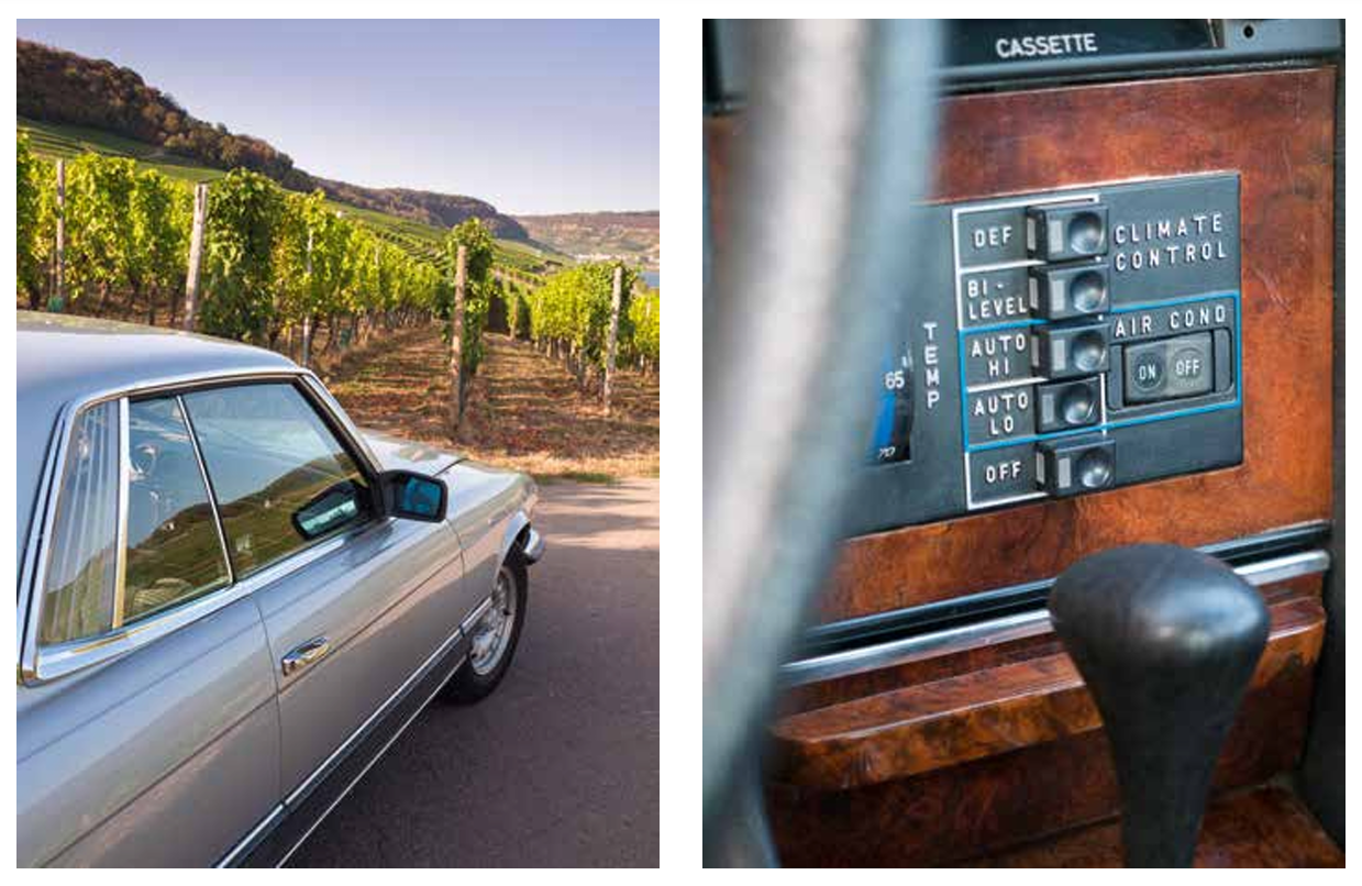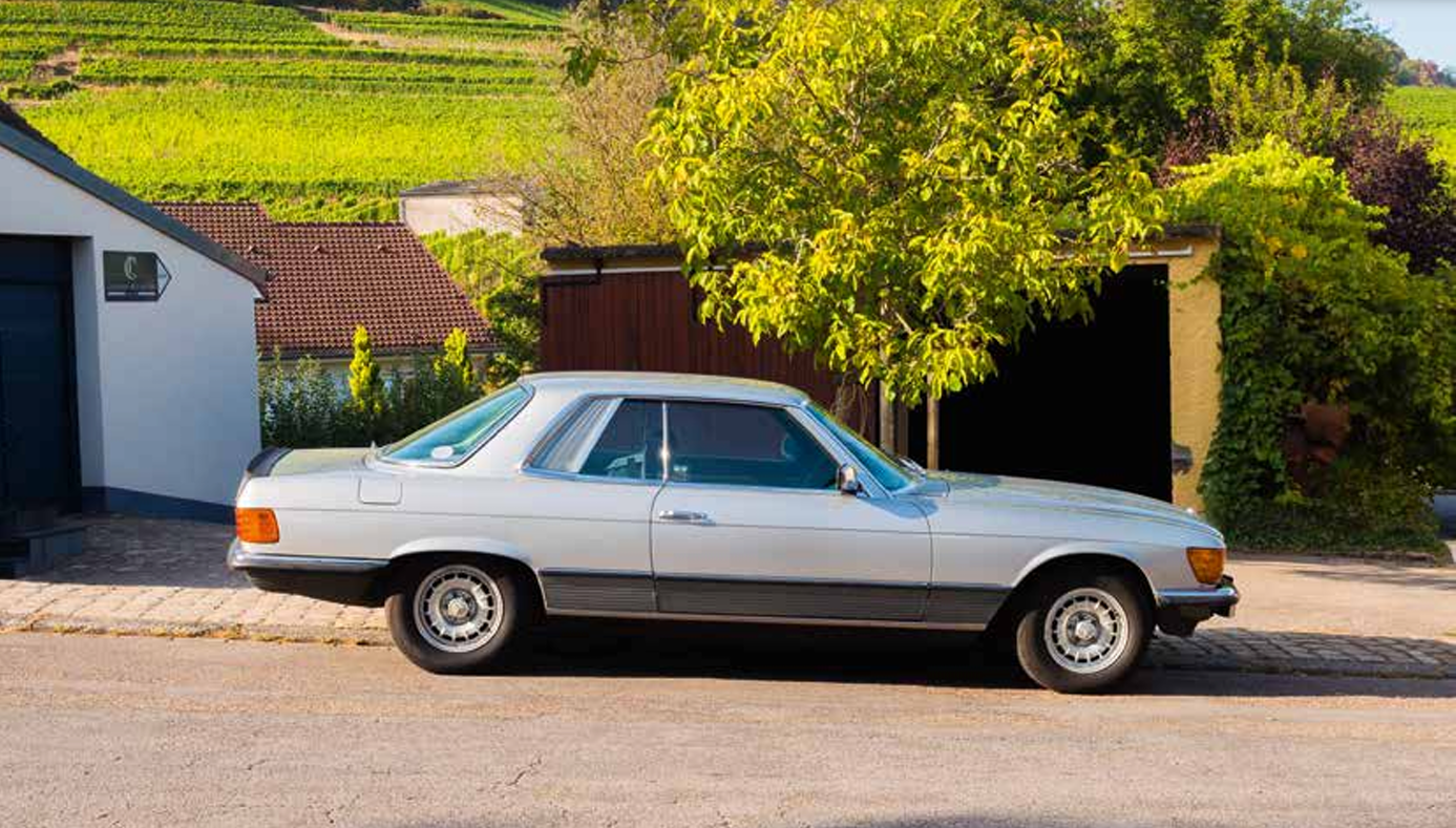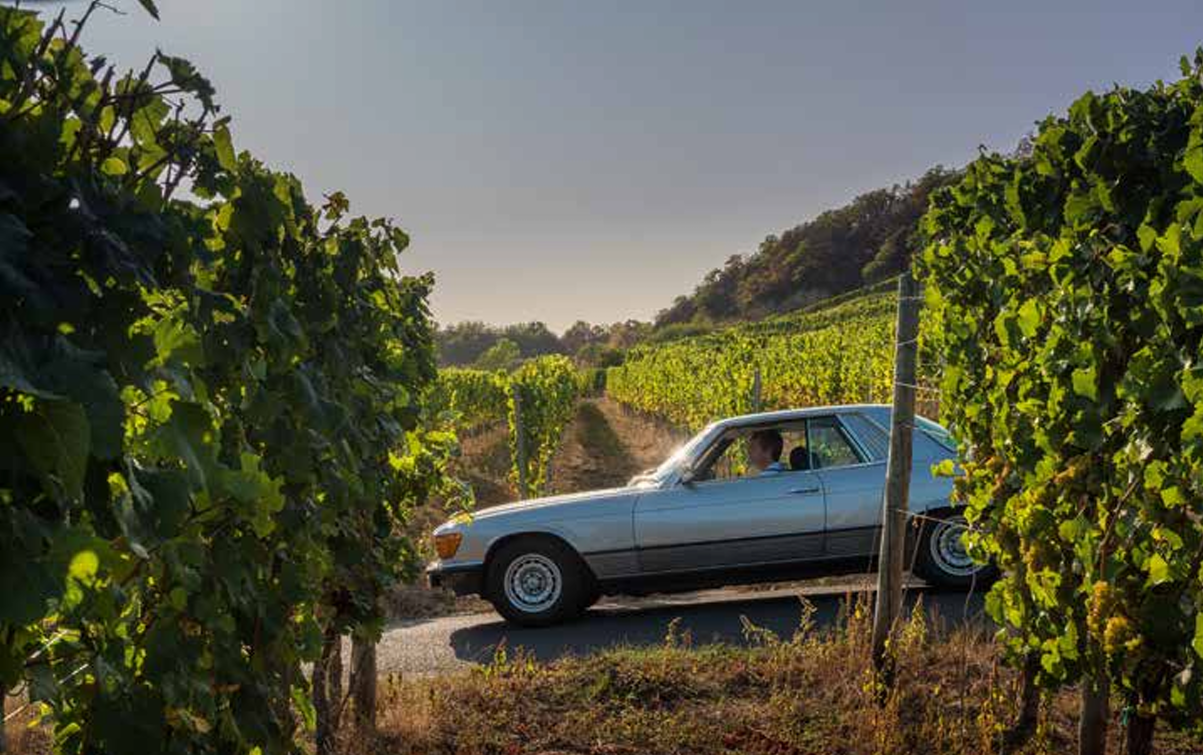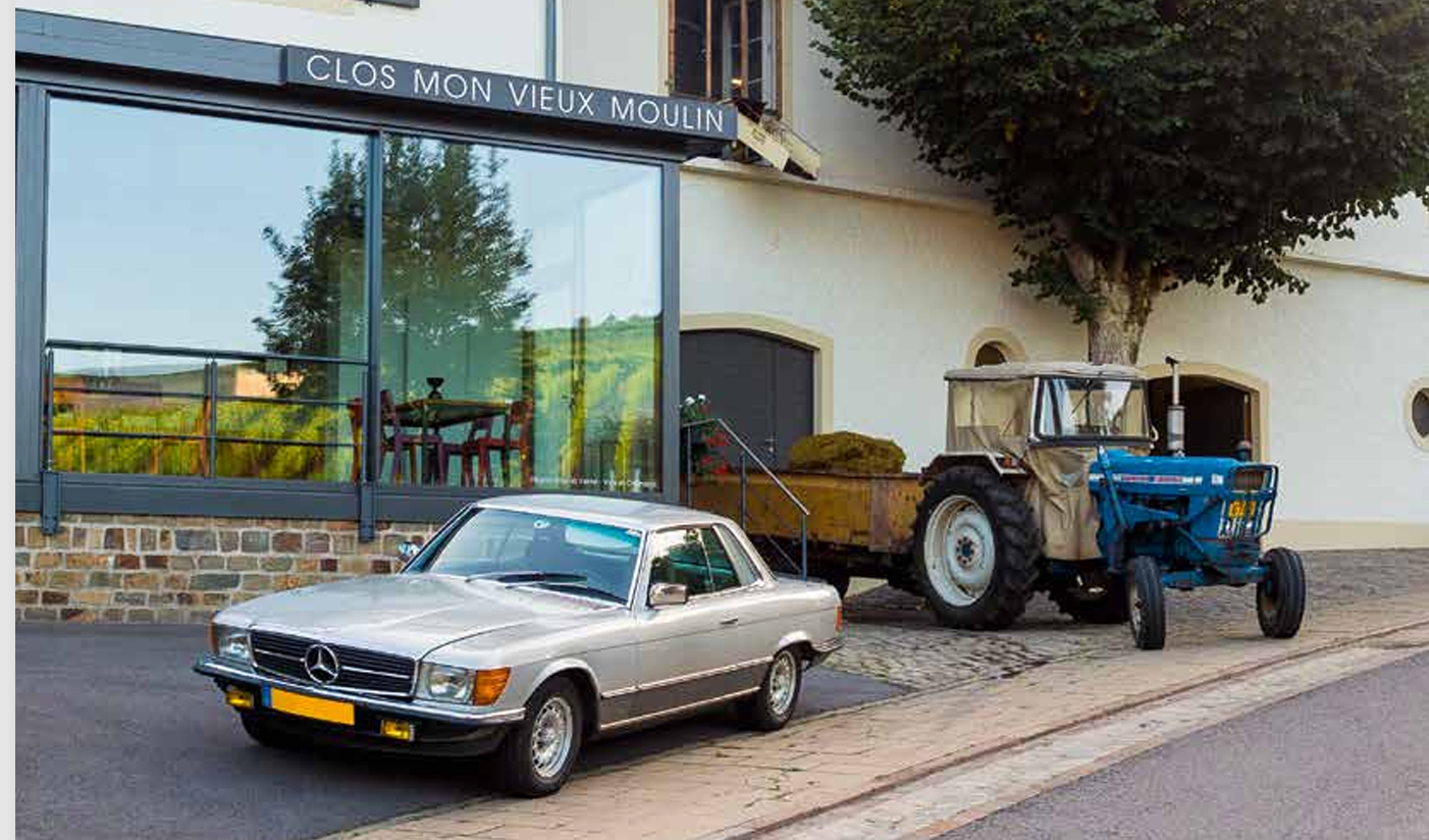 Par une belle fin d’après-midi du mois de septembre, nous visitons le domaine viticole du Clos Mon Vieux Moulin à Ahn. La ballade se fait à bord de la flamboyante Mercedes 450 SLC 5.0, conduite par son propriétaire Jean-François Zimmer. Nous montons sur les coteaux, parcourons les chemins entre les vignes, profitons de vues imprenables sur le village et la vallée de la Moselle. Après la promenade, nous retrouvons M. Duhr, le maître du domaine, qui nous invite à une dégustation de vins autour d’une conversation fort agréable.