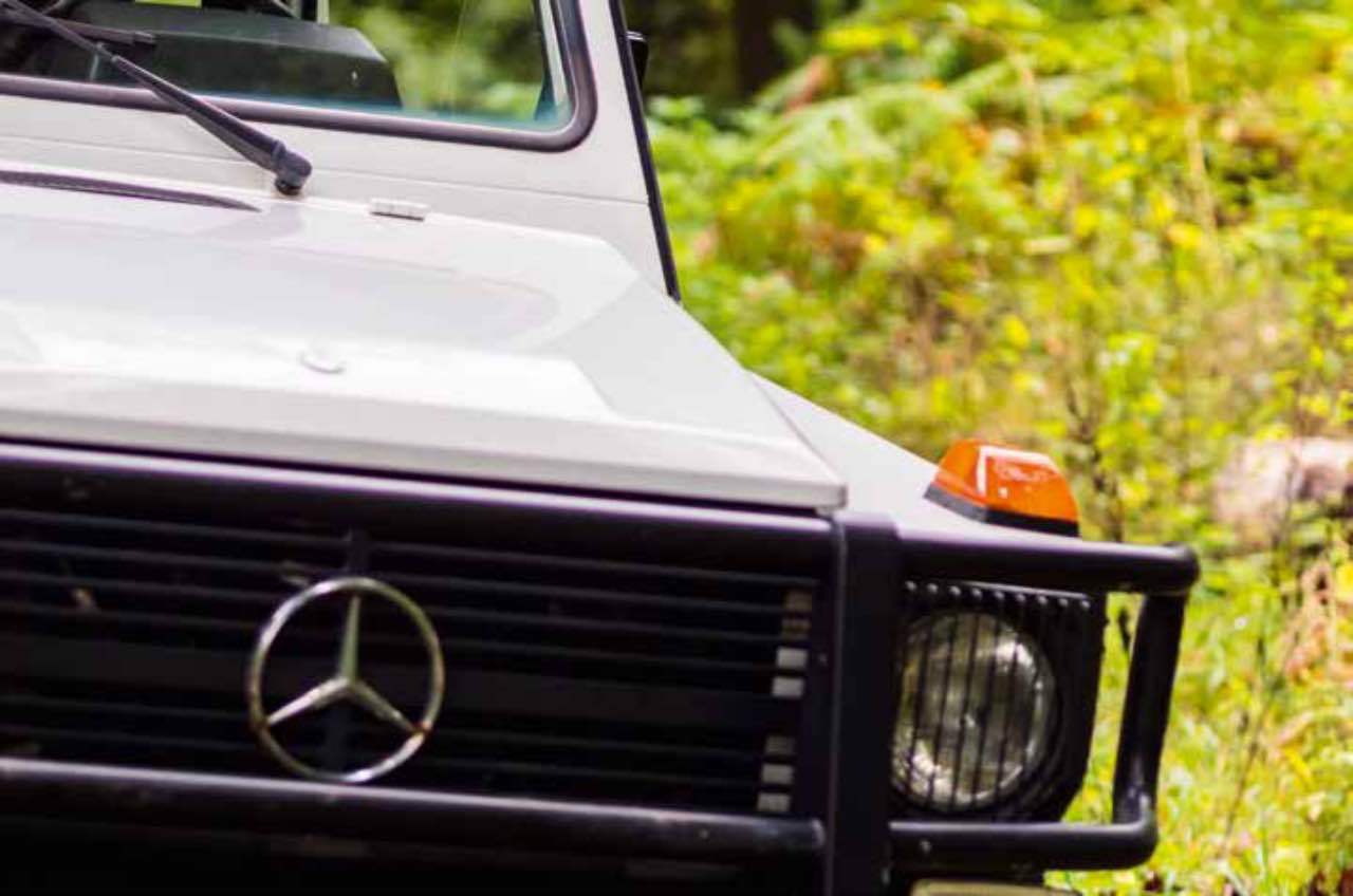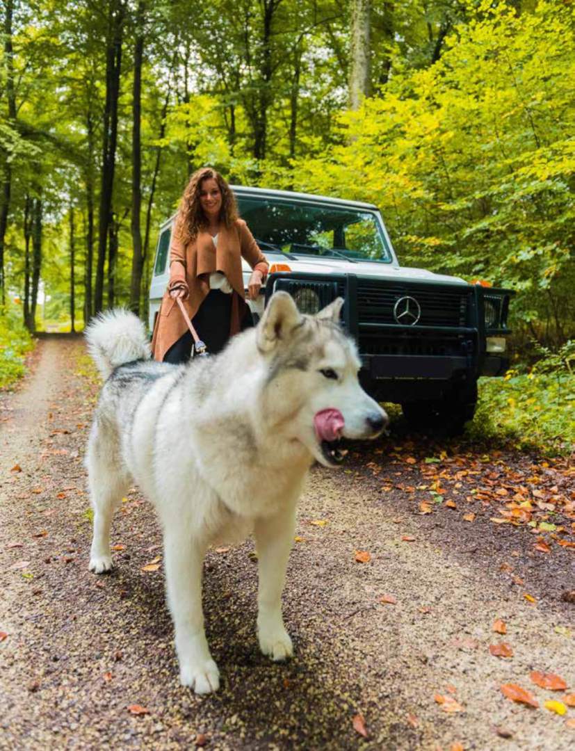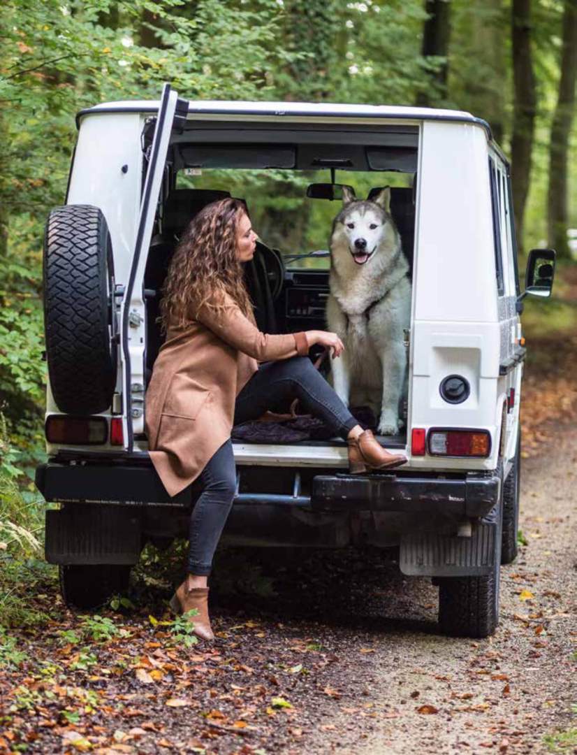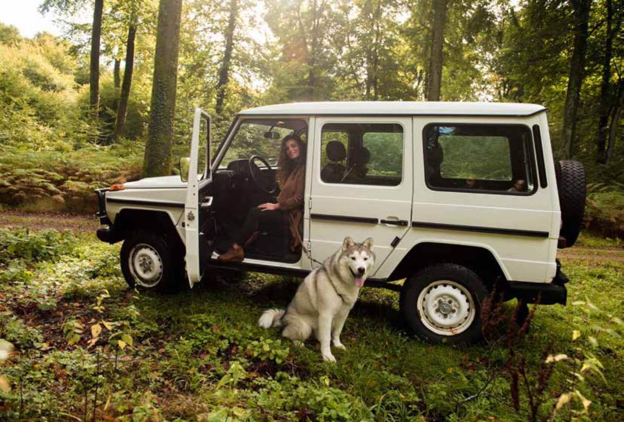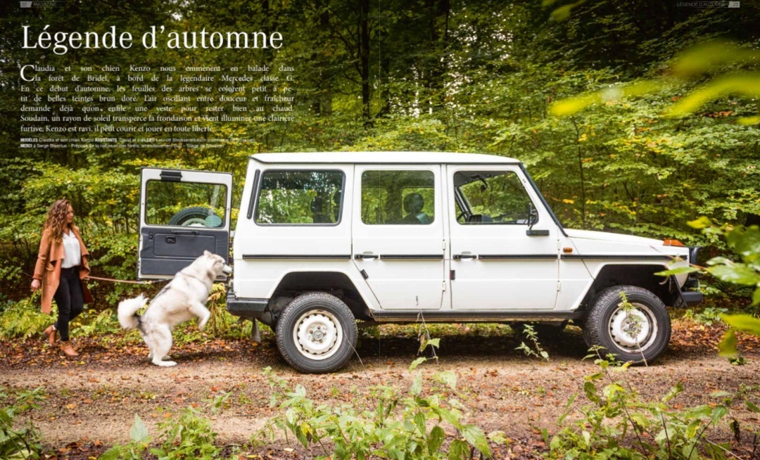 Claudia et son chien Kenzo nous emmènent en balade dans la forêt de Bridel, à bord de la légendaire Mercedes classe G. En ce début d’automne, les feuilles des arbres se colorent petit à petit de belles teintes brun doré. L’air oscillant entre douceur et fraîcheur demande déjà qu’on enfile une veste pour rester bien au chaud. Soudain, un rayon de soleil transperce la frondaison et vient illuminer une clairière furtive. Kenzo est ravi, il peut courir et jouer en toute liberté.