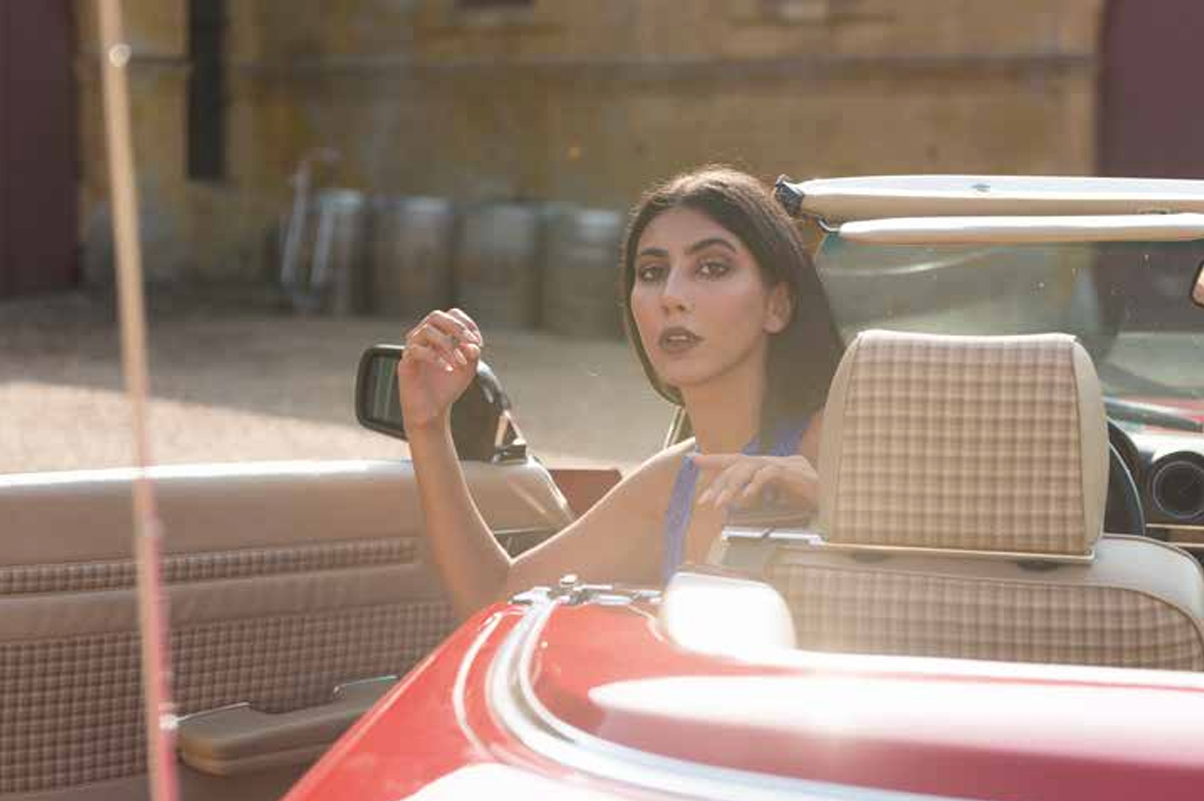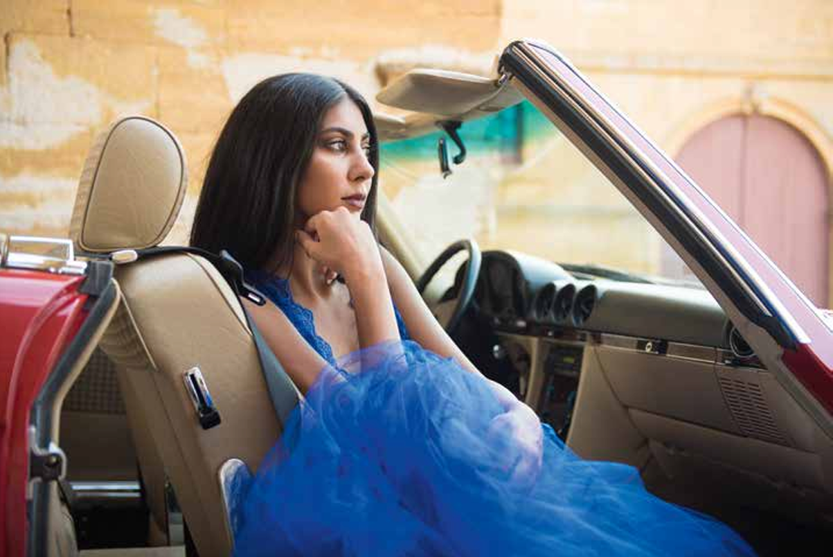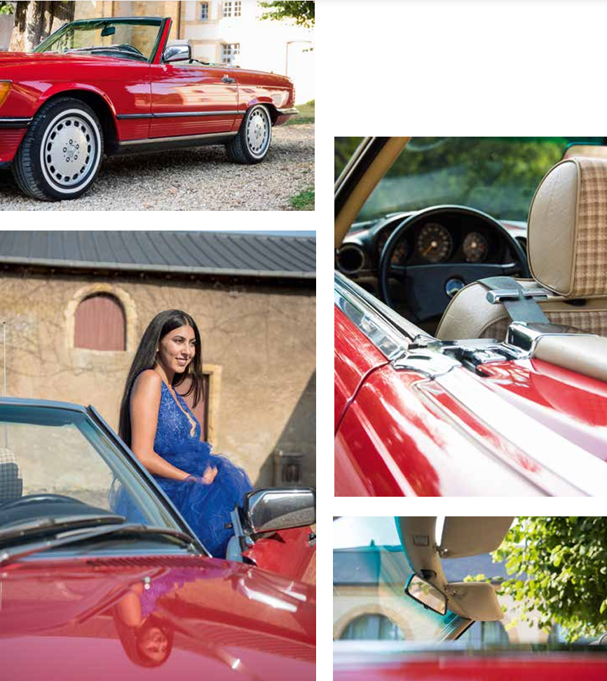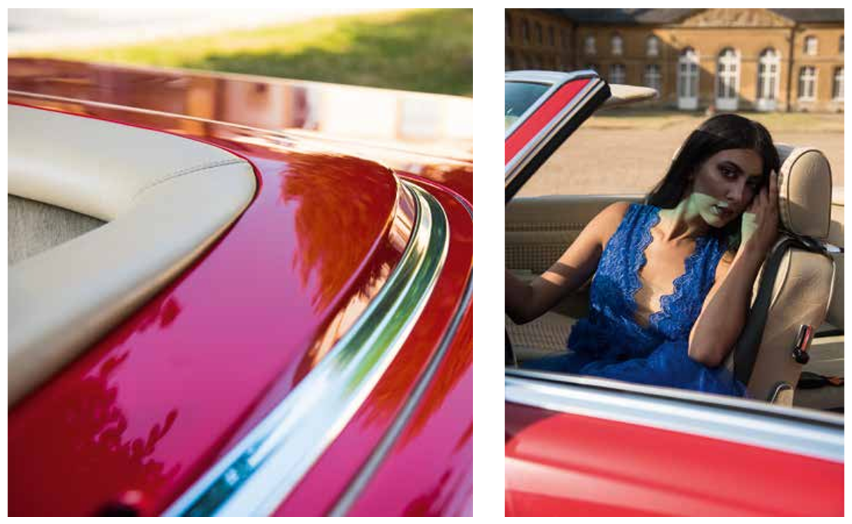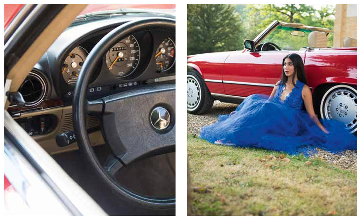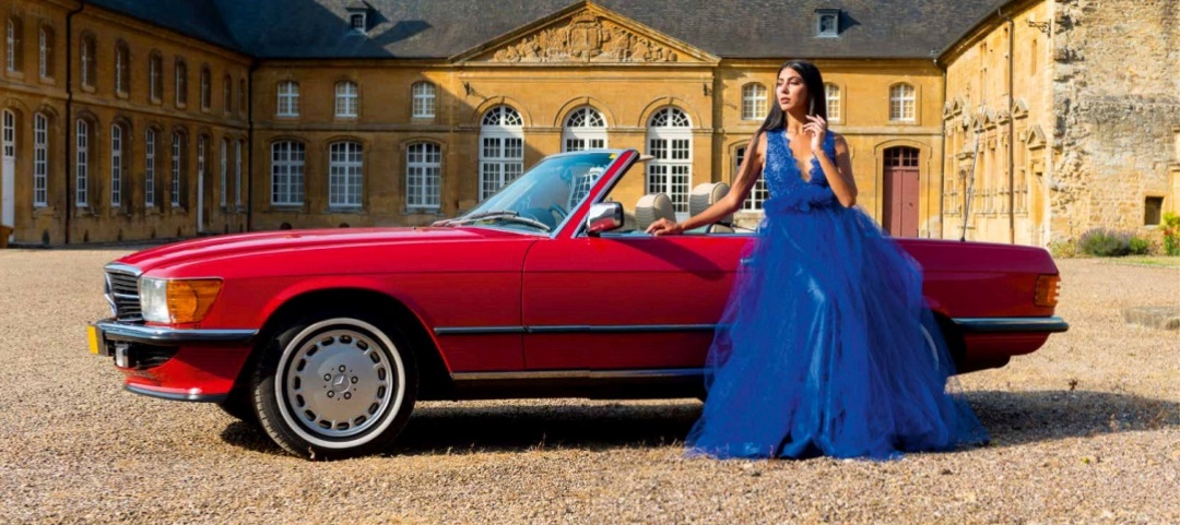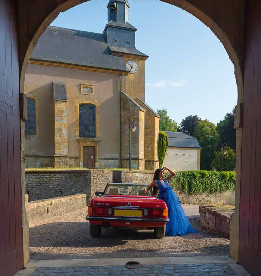 Habillée telle une princesse d’une féerique robe bleue, Katia découvre le domaine majestueux du Clos de Lorraine, qui semble sorti tout droit d’un conte de fées. Pour parfaire le tableau, elle pose à côté d’une légendaire Mercedes-Benz 300 SL de 1986, dont le rouge vif fait vibrer les pierres ancestrales du château.