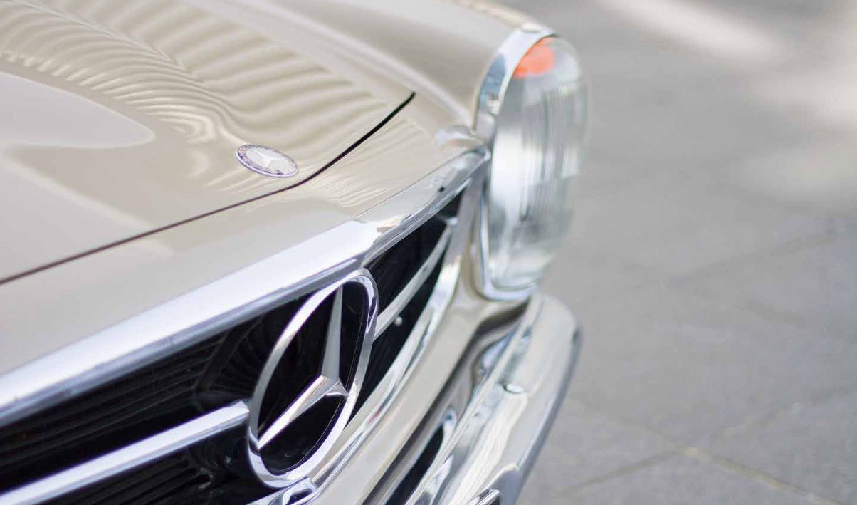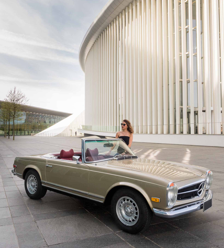 Pour Carl’s, Inês s’est prêtée au jeu de la « femme fatale » au volant d’une Mercedes-Benz 280 SL de 1970, série R113 Pagode. Comme toile de fond pour cette mise en scène glamour, la Philharmonie resplendit de toute sa blancheur éclatante. Le mystère est lancé. Comme dans « La mort aux trousses » d’Alfred Hitchcock, on peut se demander, tout comme Cary Grant dans le désert, d’où viendra le danger, d’où viendra l’ennemi